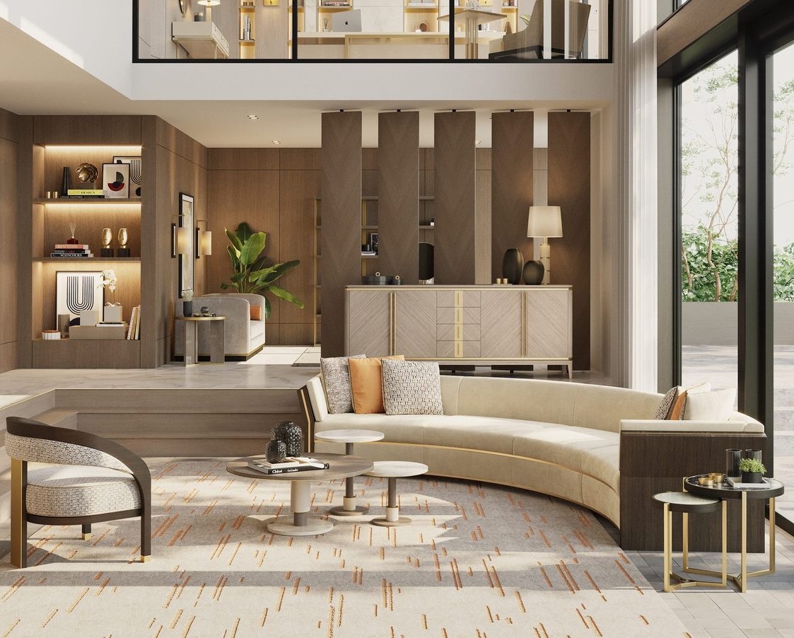 Огромные панорамные окна наполняют пространство светом, позволяя солнечным лучам играть на обтекаемых формах мебели. Бежевые и коричневые оттенки доминируют в палитре, создавая теплую и уютную атмосферу, идеально подходящую для создания комфортного домашнего уюта. Эти тона легко сочетаются с блестящими латунными вставками, которые становятся акцентами в интерьере, подчеркивающими элегантность и утонченность.