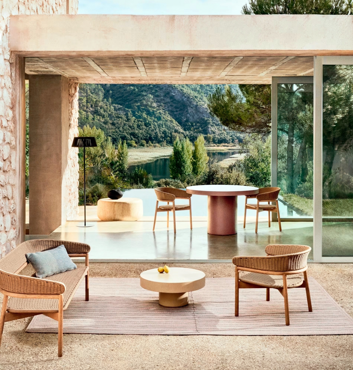 В центре обеденной зоны расположен стол Aiguablava, выполненный в минималистичном стиле. Его лаконичные линии и структура из бетона, армированного стекловолокном (GFRC), окрашенного в теплый терракотовый оттенок, создают гармонию с природой. Этот стол станет отличной основой для семейных обедов и дружеских встреч на свежем воздухе.