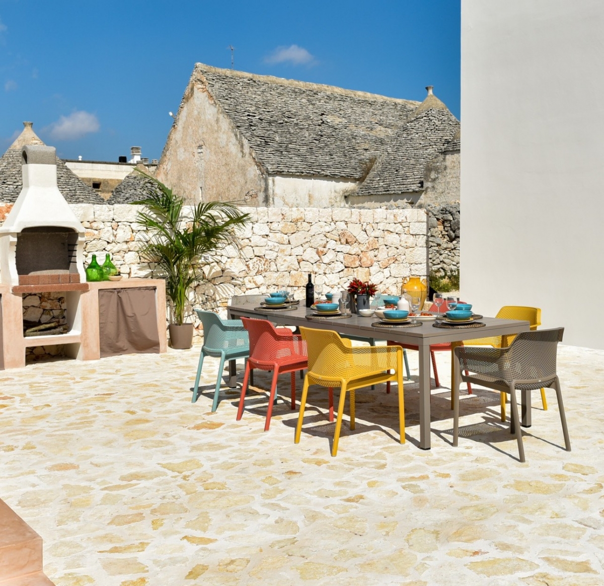 Вокруг стола расположились восемь стульев, выполненных в ярких цветах — бирюзовом, серо-коричневом, жёлтом и красном. Модель стульев Net от фабрики Nardi — это не просто предмет мебели, это стиль, это мир, это совершенно новое настроение. Эти моноблочные модели из стеклопластика с перфорированным рисунком, равномерно распределённым по трехмерной поверхности сиденья, обеспечивают комфорт и современные эстетические качества.