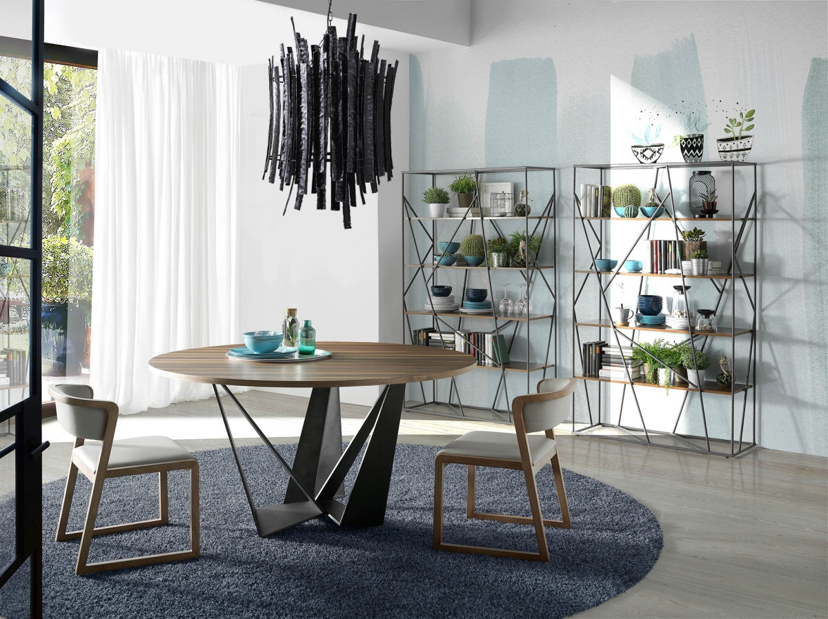 Весь мебельный ансамбль складывается вокруг обеденного стола с круглой деревянной столешницей и металлическими черными ножками. Под стиль столу подобраны стулья замысловатой, но в то же время лаконичной формы. Завершает геометричный ансамбль книжный стеллаж с открытыми полками. На нем идеально разместятся не только ваши любимые произведения, но и кухонные принадлежности, а также цветы и растения в красивых кашпо. Главное здесь - не нарушать изначальной задумки, и не ставить на открытые полки слишком много цветных деталей.