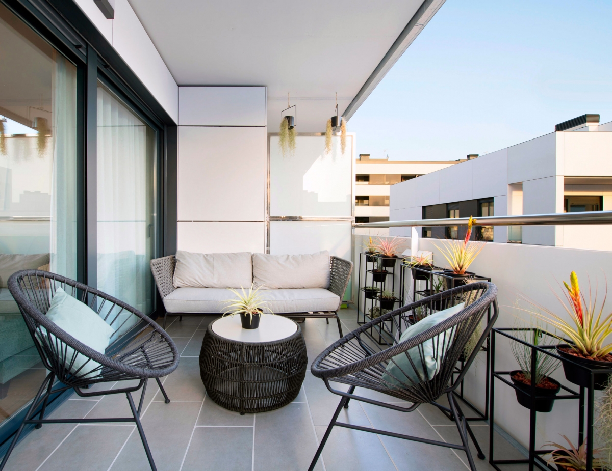 Модный и колоритный интерьер уголка для отдыха в смешанном стиле. Ансамбль создан для размещения на террасе или широком балконе, однако, его также вполне можно располагать в гостиных. Четкие геометрические формы и сдержанные цвета предметов понравятся любителям строгих современных убранств, благодаря им интерьер хорошо подходит для использования в общественных зданиях или офисах. Воздушность конструкций мебели помогают создавать в помещениях атмосферу романтики, красоты, интриги. Такой интерьер выберут люди с ярким характером и богатым воображением, которые, впрочем, ценят возможность продемонстрировать свою успешность окружающим.