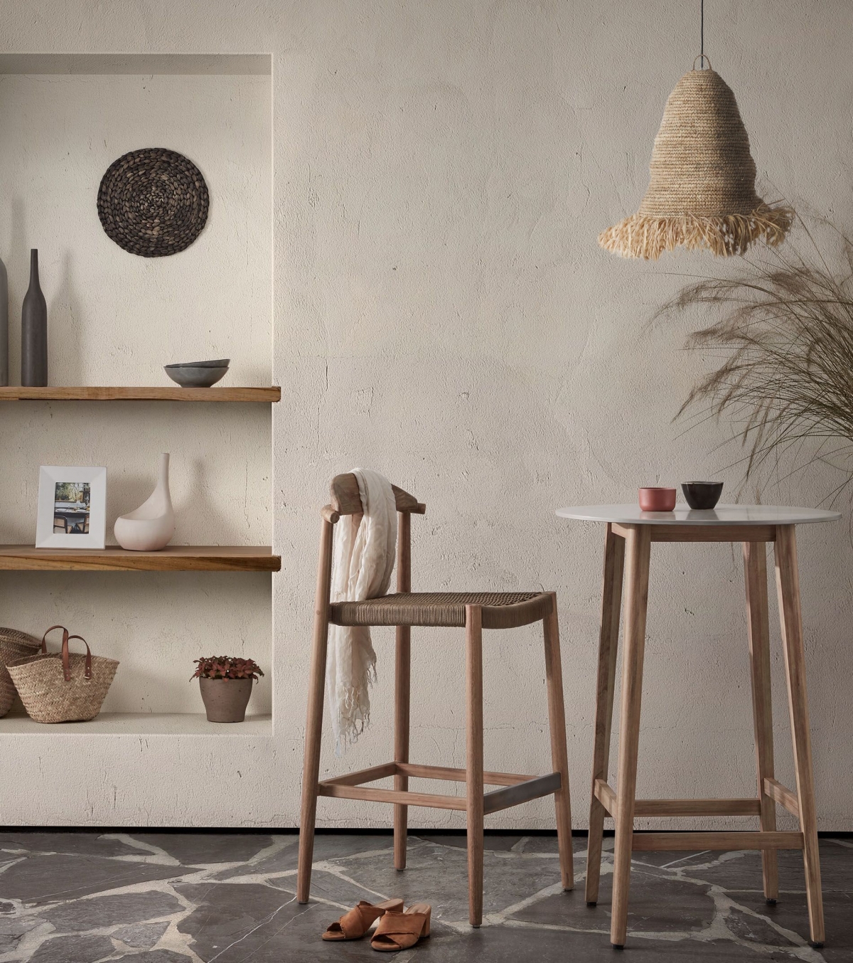 Барные стол Georgette и стул Glynis составляют идеальную пару для комфортных посиделок своих владельцев. Предметы выглядят просто, но, в то же время, благородно благодаря своей ценной натуральной древесине эвкалипта. Ярче и определеннее стиль помещения делает уникальный дизайнерский светильник Shianne, созданный из соломы. Смягчить и разнообразить облик комнаты удалось с помощью аксессуаров - например, нежной керамической вазы Norks.