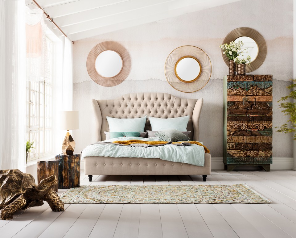 Особый шик интерьеру спальни придает эклектика стилей. Так, кровать в стиле барокко здесь сочетается с необычным шкафом в этническом стиле, который сейчас находится на пике популярности. Декоративная фигура черепахи на полу и зеркала в виде солнца вторят стилистике шкафа.