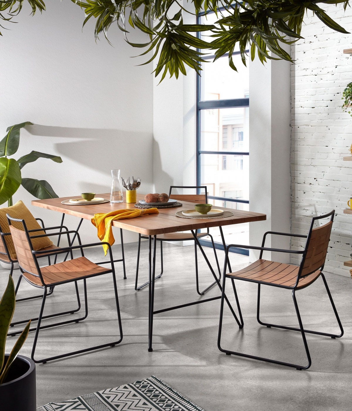 Лаконичная и изящная обеденная зона, способная стать дополнением практически любого интерьера кухни или уголка гостиной. Комплект оценят владельцы небольших жилищ: тонкие линии и воздушные конструкции предметов смотрятся аккуратно, пропуская максимум света и не загромождая пространство. Несмотря на обилие практичных и долговечных металлических частей, мебель выглядит легко и солидно. Красота расцветки и текстуры натуральной древесины ценной породы - тика - проявилась в ее облике в полной мере. Универсальность и функциональность комплекта позволяет успешно использовать его буквально везде - дома, в офисе, кафе.