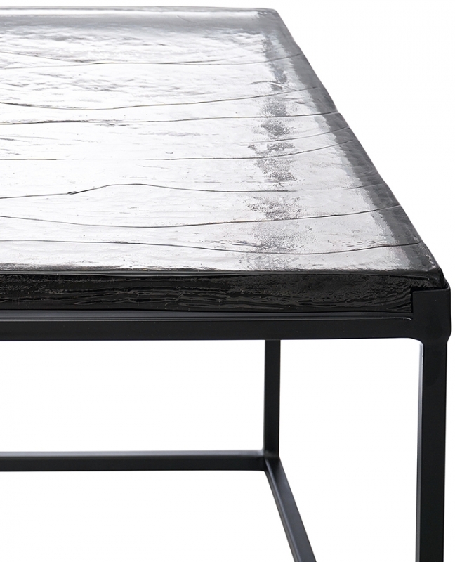 Столешница черного цвета выполнена из стекла с интересной текстурой, что придает ей особый шарм. Металлический каркас с матовым черным напылением создает контраст и добавляет прочности.