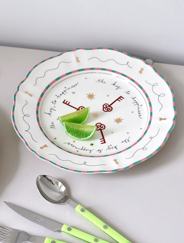 Обеденная тарелка, идеальна для подачи основных блюд: Её округлая форма с нежными волнистым краем и насыщенная цветовая гамма создают ощущение праздника и радости. Декор в виде ключей и звёзд, выполненный в красных, золотых и нежных пастельных тонах, добавляет шарма и оригинальности. Стильный бортик, оформленный в полоску, подчеркивает изящество тарелки. Каждый элемент дизайна продуман до мелочей, что делает эту тарелку настоящим украшением вашего стола.