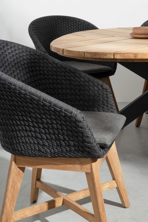 Тёплая фактура тикового дерева и выразительное чёрное основание создают образ стола, вокруг которого хочется собираться чаще. Этот садовый обеденный стол идеально подойдет для террасы, патио или просторной зоны отдыха и поможет создать атмосферу спокойного, естественного комфорта.