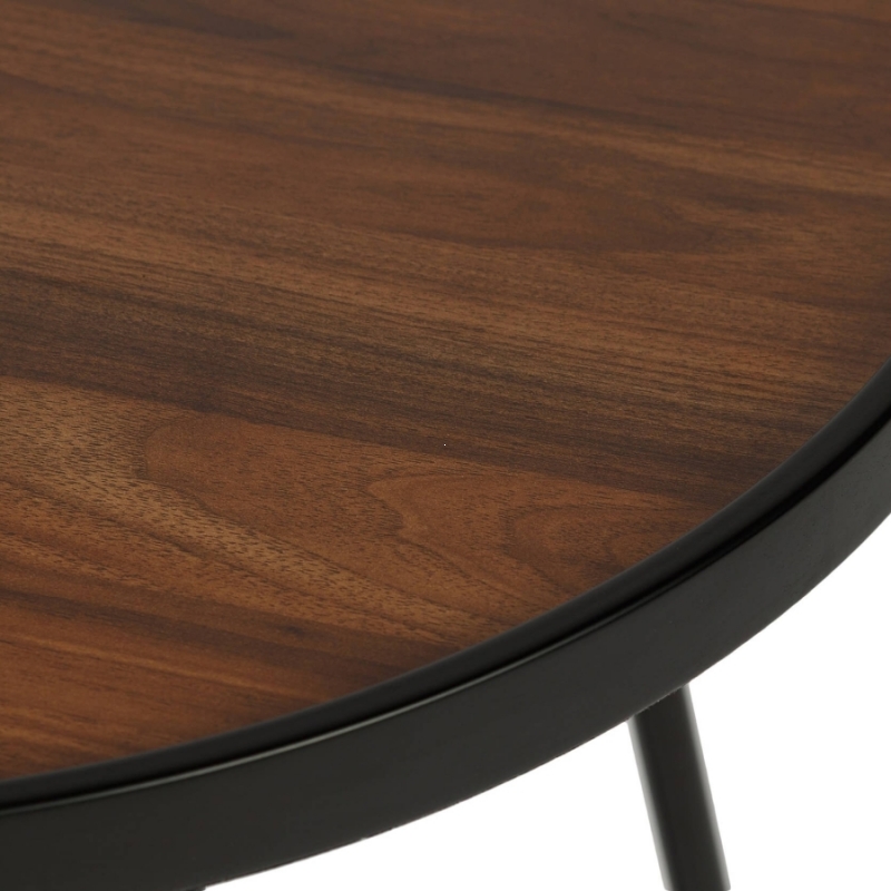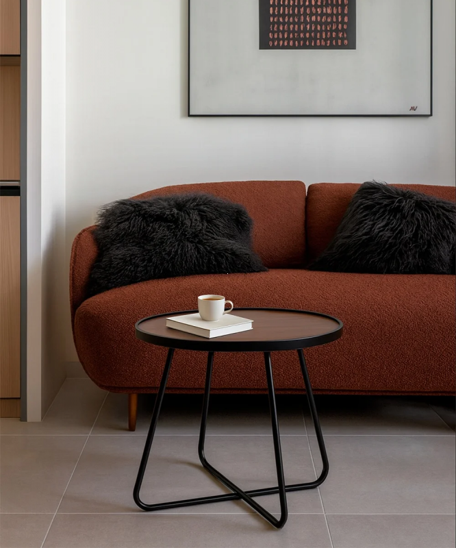 Журнальный столик Calipa в тёплом ореховом оттенке с чёрным металлическим основанием выглядит сдержанно, стильно и очень современно. Круглая столешница с древесной текстурой смягчает строгую геометрию каркаса, а тонкий бортик по краю делает силуэт более собранным и аккуратным. Металлические ножки с плавными линиями создают лёгкий, почти графичный образ, благодаря чему столик не перегружает пространство. Такое сочетание фактур — матовый металл и поверхность под дерево — особенно хорошо работает в интерьерах, где важны визуальный баланс, уют и чистота формы.