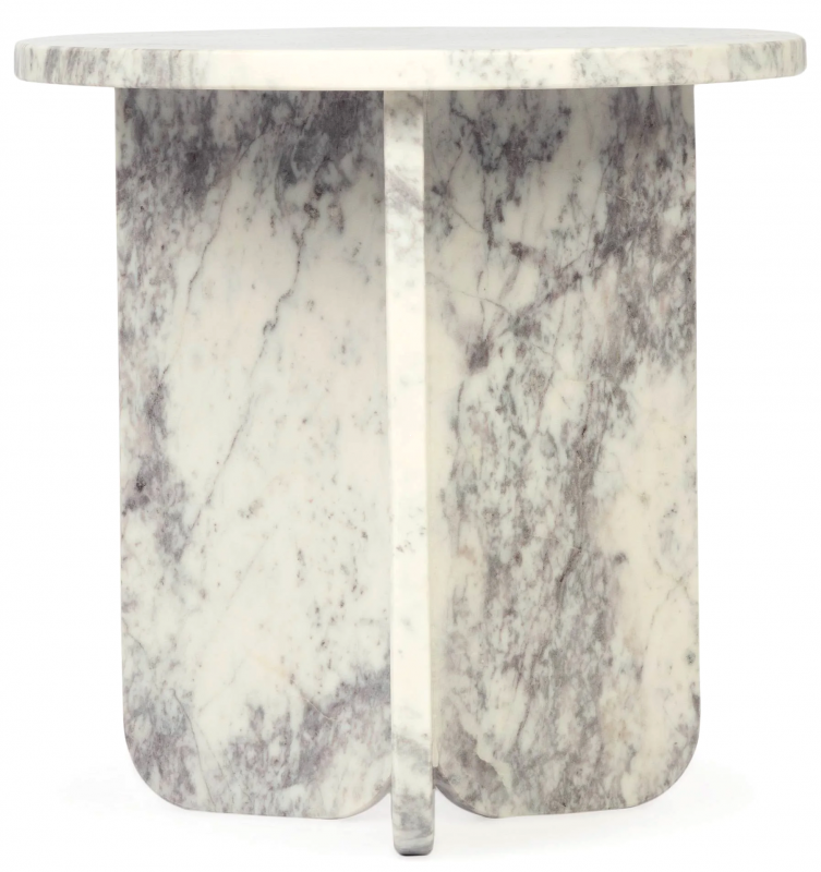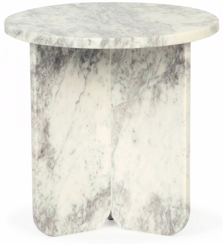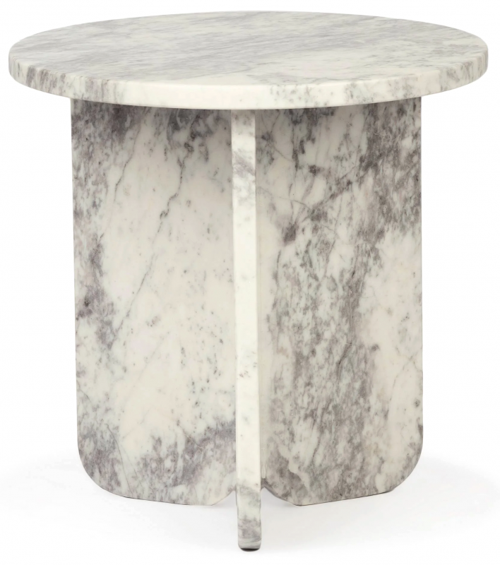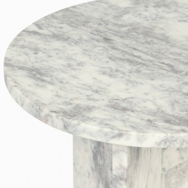 Столик Pia в светлом мраморном исполнении сочетает округлую столешницу и скульптурное основание, собранное из массивных вертикальных плоскостей. Натуральная бело-серая палитра с дымчатыми прожилками выглядит благородно и живо: рисунок камня делает каждое изделие визуально уникальным. Форма столика мягкая, но архитектурная — без лишнего декора, с акцентом на материал, пропорции и чистоту линий. Гладкая полированная поверхность красиво отражает свет, а монолитный силуэт создает ощущение устойчивости, спокойствия и интерьерной завершенности. Такой журнальный или приставной столик работает как функциональный предмет и как выразительный декоративный акцент.