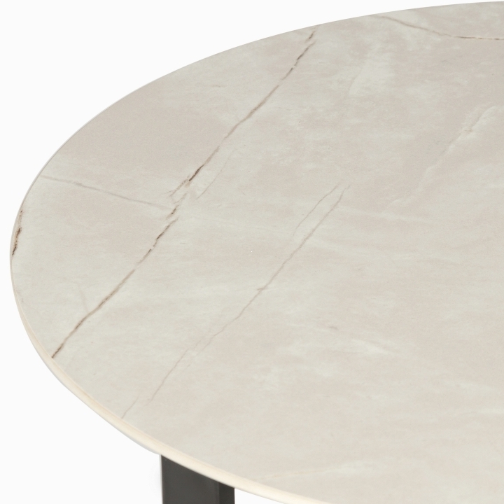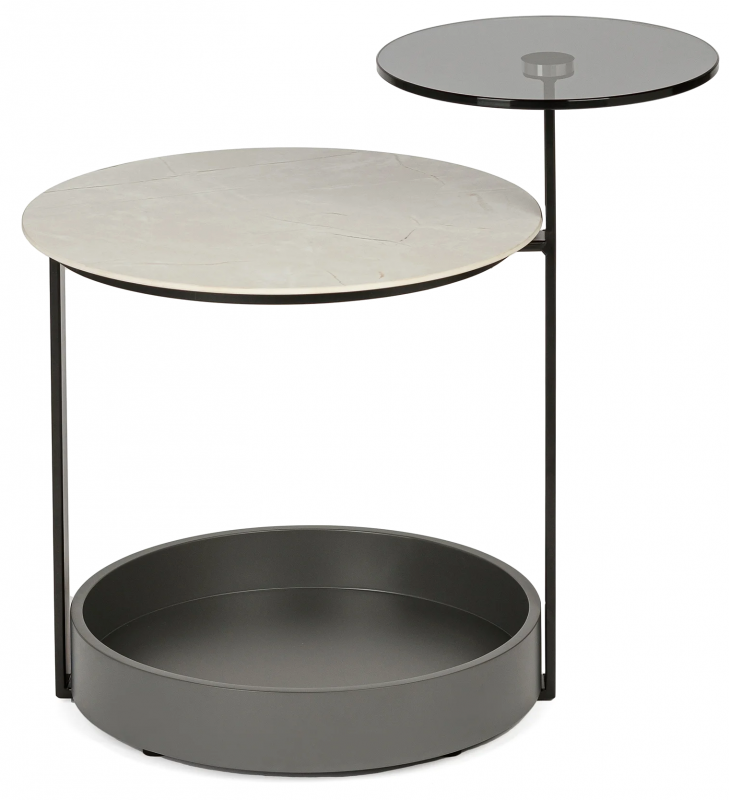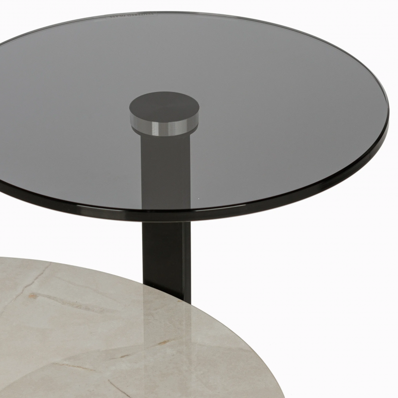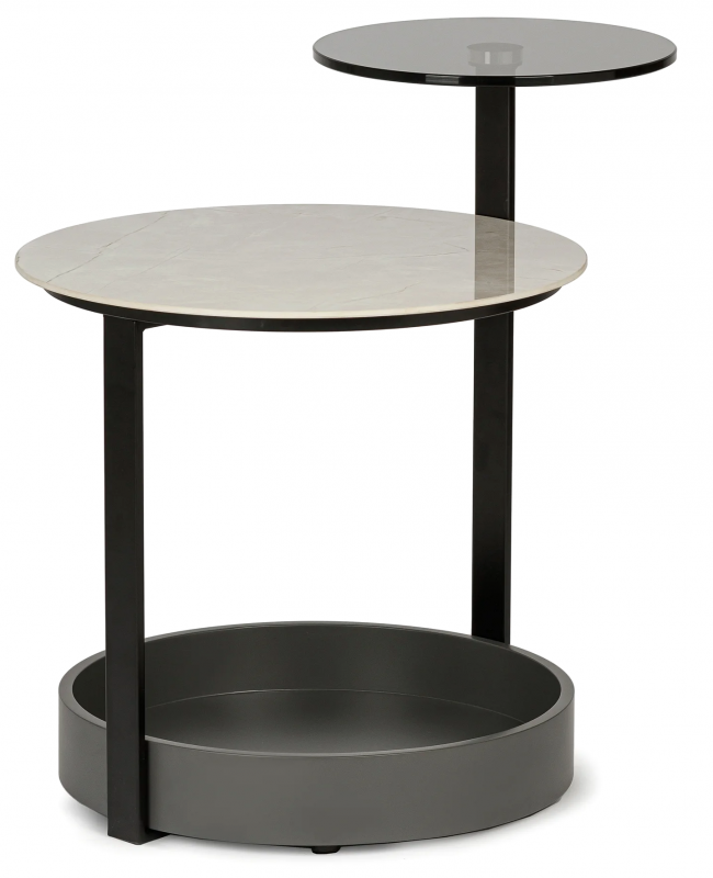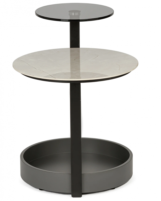 Кофейный столик Laurie в чёрном цвете с керамической столешницей, стеклянной верхней полкой и металлическим каркасом выглядит графично, аккуратно и очень современно. Композиция строится на сочетании нескольких уровней: светлая круглая столешница с деликатным каменным рисунком смягчает строгие линии, затемнённая стеклянная полка добавляет глубину, а нижнее круглое основание создаёт ощущение завершённости. Матовая фактура металла подчёркивает архитектурный характер модели, а тонкие вертикальные опоры делают силуэт визуально лёгким. Столик смотрится статусно, но не тяжело, поэтому легко поддерживает интерьер, не перегружая его.