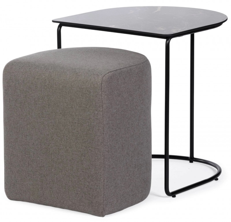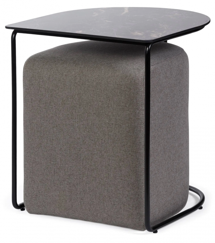 Столик с пуфом Eglens 44X42X47 CM в графитово-серой гамме с черной металлической рамой и темной керамической столешницей выглядит лаконично, легко и архитектурно. Асимметричная столешница с мягко скругленными линиями придает модели дизайнерский характер, а тонкий стальной каркас подчеркивает визуальную легкость конструкции. Темная керамика с деликатным мраморным рисунком добавляет глубину и ощущение благородного материала. Объемный пуф в серой тканевой обивке смягчает строгую геометрию металла и делает композицию более уютной. В результате получается предмет мебели, который одновременно служит журнальным столиком, приставным столиком и дополнительным местом для сидения.