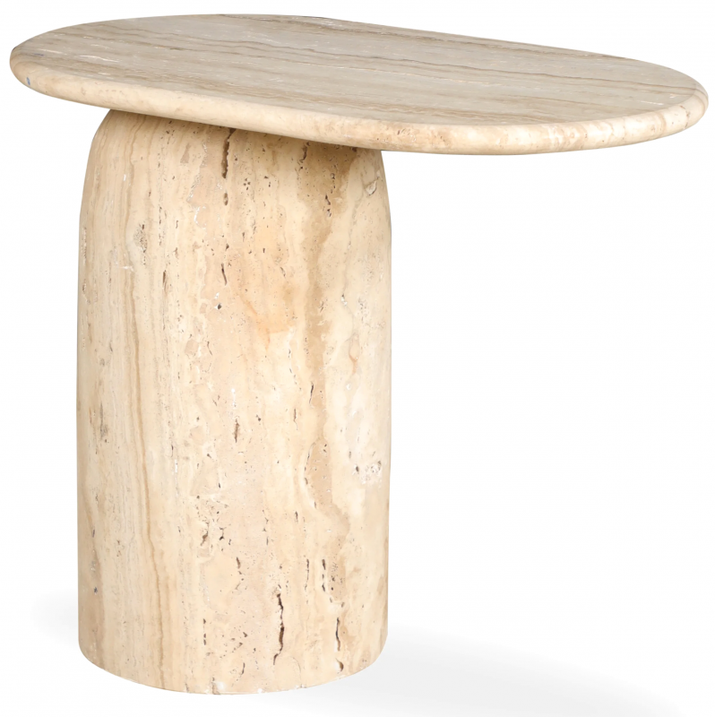 Тёплый оттенок натурального травертина, мягко скруглённые линии и монолитный силуэт создают ощущение спокойствия и визуальной чистоты. Этот приставной столик идеально подойдет для гостиной, спальни или лаунж-зоны и поможет создать атмосферу уюта, тишины и тактильной естественности.