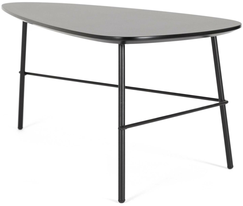 Кофейный столик Andrew в чёрном цвете с деревянной столешницей из МДФ и стальными ножками выглядит легко, собранно и очень современно. Его вытянутая столешница необычной формы со скруглёнными краями смягчает интерьер и делает композицию более живой, чем у стандартных прямоугольных моделей. Тонкий профиль столешницы визуально не перегружает пространство, а чёрный металлический каркас с наклонными опорами добавляет графичности и характерной дизайнерской выразительности. Матовая фактура смотрится сдержанно, практично и легко сочетается с текстилем, деревом, стеклом и камнем.