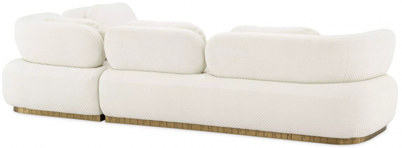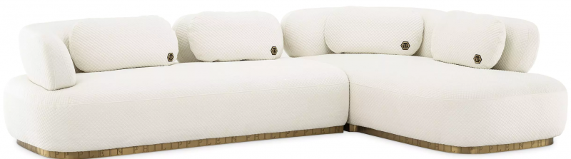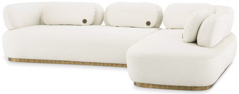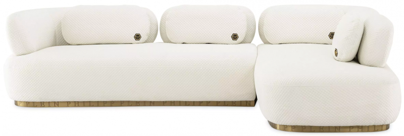 Благодаря экстравагантным пропорциям и модульной L-образной форме на диване Signature Lounge найдётся место для всех желающих. Представленный в элегантном и мягком белом стёганом бархате, он располагается на античном латунном основании с брендингом Philipp Plein.