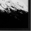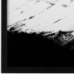 Постер выполнен в минималистичном стиле, с преобладанием черно-белых оттенков. Контраст между белым снегом и темными скалами создает эффект глубины и подчеркивает рельефность гор.