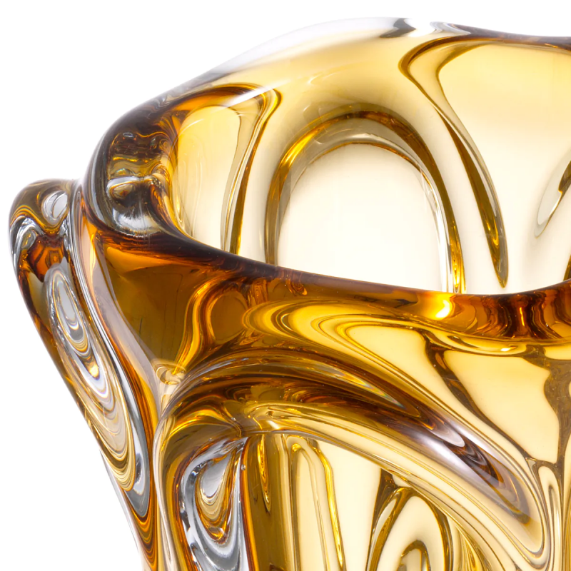 Ваза выполнена в ар-деко стиле с ярким желтым цветом, который гармонично сочетается с прозрачными вставками. Ключевые элементы дизайна включают изогнутые линии и арочные украшения, что делает её настоящим произведением искусства.