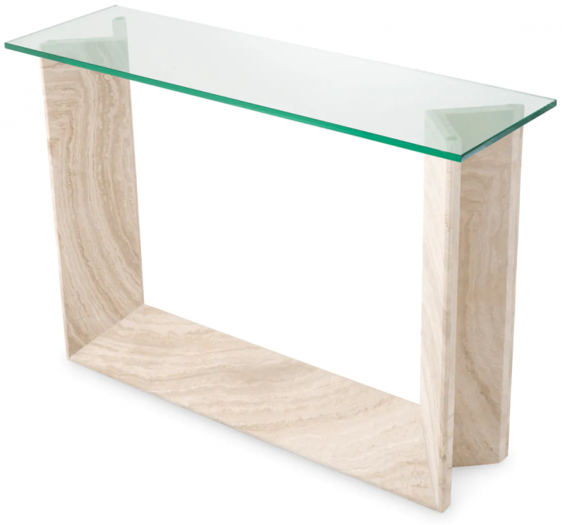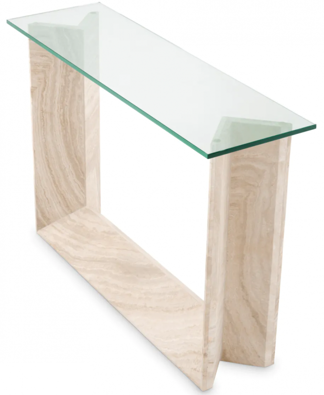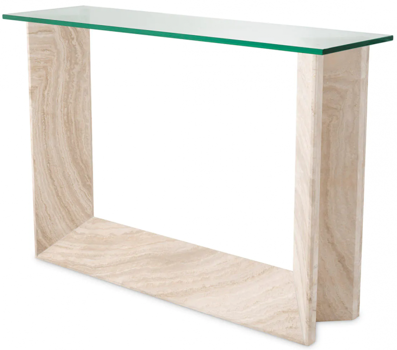 Indulge in the opulence of the Fortuna Console Table, a masterpiece of exquisite design. Crafted from the finest travertine, each piece is hand-selected to ensure a one-of-a-kind look rich in unique character and natural beauty. The clear rectangular glass top adds a touch of glamour and sophistication, creating a stunning contrast against the organic textures of the travertine.