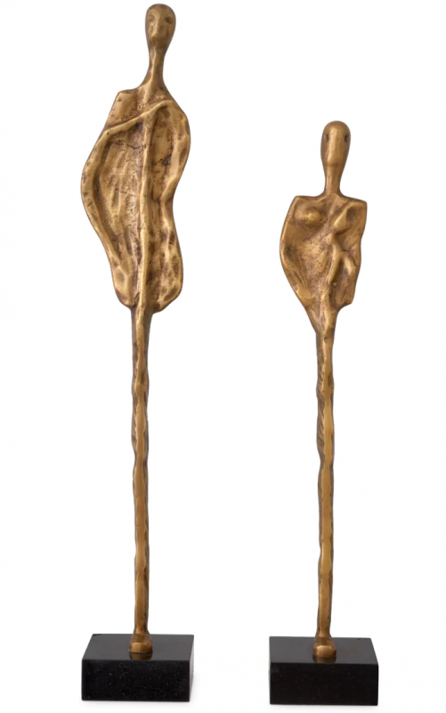 Набор состоит из двух статуэток, каждая из которых воплощает в себе уникальную художественную интерпретацию человеческой фигуры. Стильные формы и текстуры, выполненные в винтажном латунном покрытии, контрастируют с современными черными гранитными основаниями. Эти детали создают ощущение изысканности и утонченности, приглашая взглянуть на них снова и снова. Каждый элемент выделяется своей неповторимой фактурой, создавая динамику в пространстве.