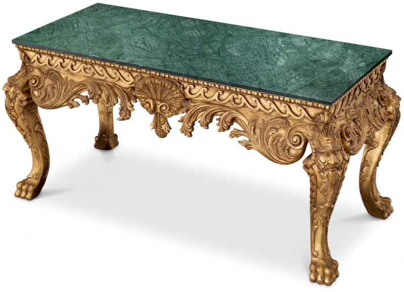 Behold the "Side Table Matthias", an icon within The Met x Eichholtz collection. With its antique gold finish and stunning green marble, this handcrafted masterpiece boasts a unique character, with each piece displaying distinct variations. It exudes grandeur. Inspired by Matthias Lock's designs, it features intricate details like shell motifs, classical masks, lion's paws, and rich acanthus leaves. The water gilding adds a touch of brilliance, making it a timeless addition to your home. HISTORIC PROVENANCEThe Side Table Matthias is inspired by a pair of magnificently ornate British side tables (ca. 1740) thought to be influenced by an unfinished drawing by the designer and carver Matthias Lock (British, ca. 1710–ca. 1765). The Met’s tables, made from carved and gilded pine with a modern scagliola top of fine plaster, feature details such as large shell motifs, classical masks, lion's paws, curling acanthus leaves, and a running Vitruvian scroll, typical of the British version of the French Rococo style. The Side Table Matthias is a celebration of the original design, crafted in an antiqued gold finish with an elegant green marble top.