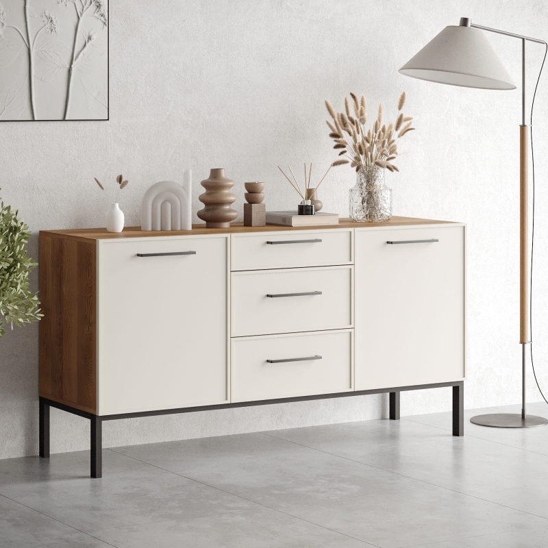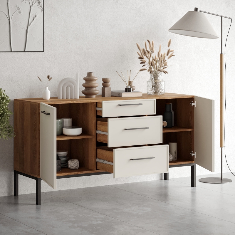 "Комод Nicole" оснащен двумя дверками и тремя ящиками, что позволяет удобно хранить различные предметы и вещи. Вы сможете легко организовать свое пространство и держать все необходимое под рукой.