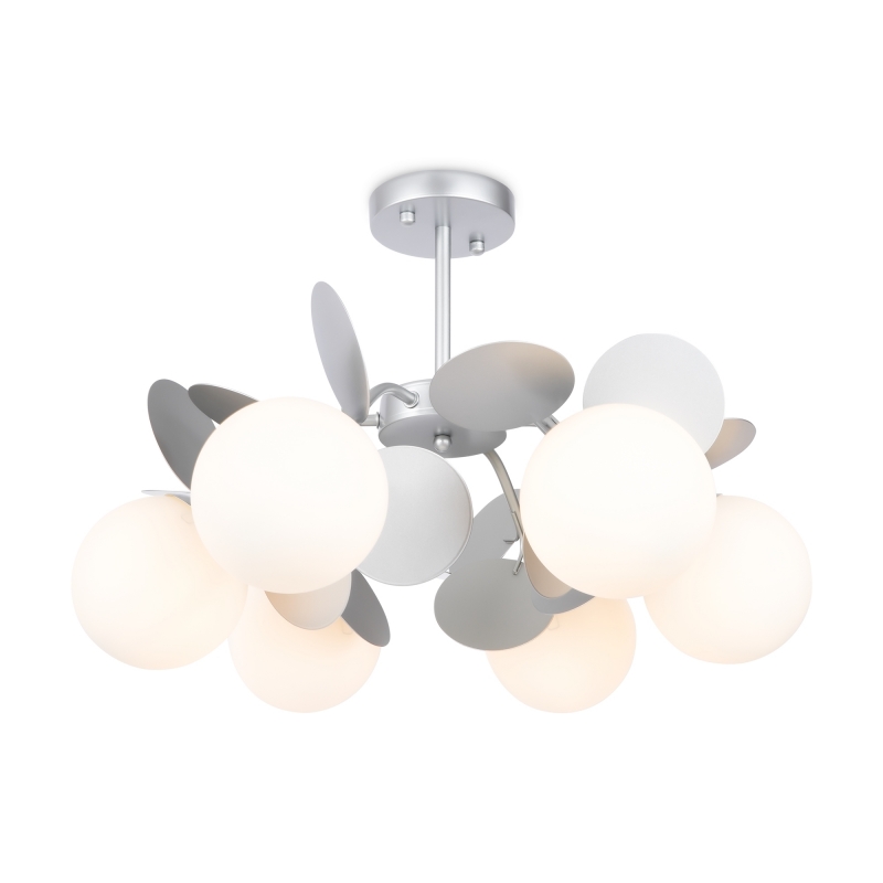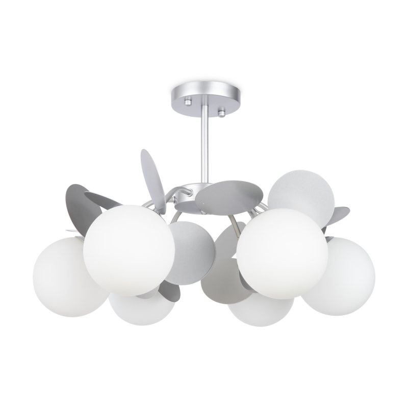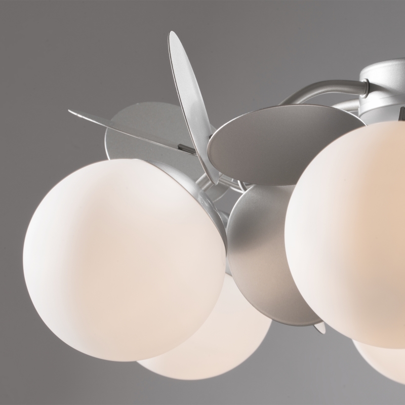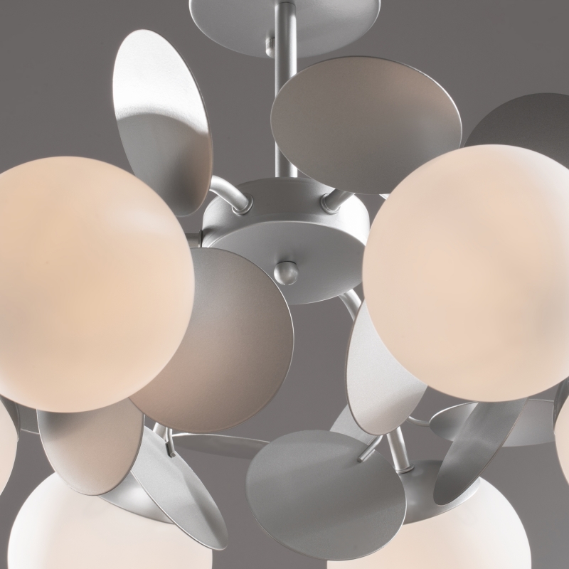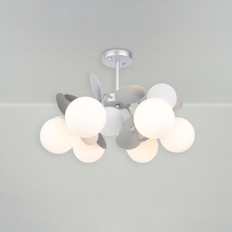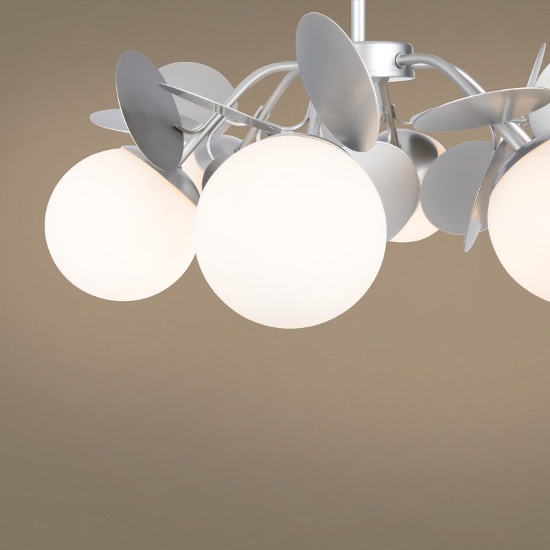 Люстра имеет уникальную конструкцию, в которой объединены 6 сферических плафонов, выполненных из стекла, и декоративные элементы из металла. Серебристый цвет металла гармонично сочетается с белыми плафонами, что делает изделие универсальным для любого интерьера. Матовая фактура и округлые формы придают люстре легкость и свежесть. Дизайн вдохновляет на создание светлого и теплого пространства.