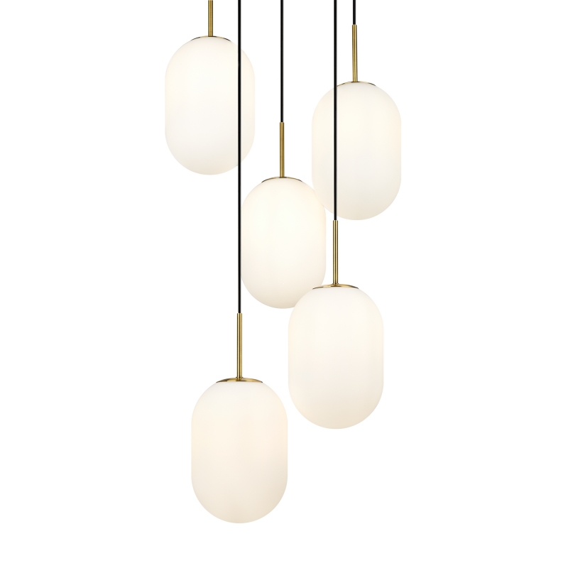 Этот светильник привлекает внимание своим изящным сочетанием латунного основания и матового стеклянного абажура. Плафоны овальной формы подчеркивают современный стиль, а их мягкая структура создает комфортное рассеянное освещение. Латунная отделка добавляет нотку роскоши и элегантности, а белое стекло придает светильнику легкость и воздушность.