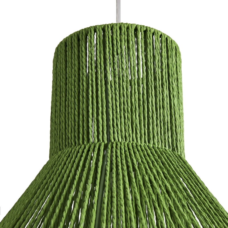 Этот светильник имеет уникальную конструкцию, выполненную из бумаги и металла, с выразительными линиями и фактурой. Трендовый зеленый цвет абажура привлекает внимание и создает ощущение свежести. Конструкция имеет форму усеченного конуса, что делает ее универсальной для разных стилей интерьера. Мягкое освещение, рассеянное через абажур, создает теплую и уютную атмосферу.