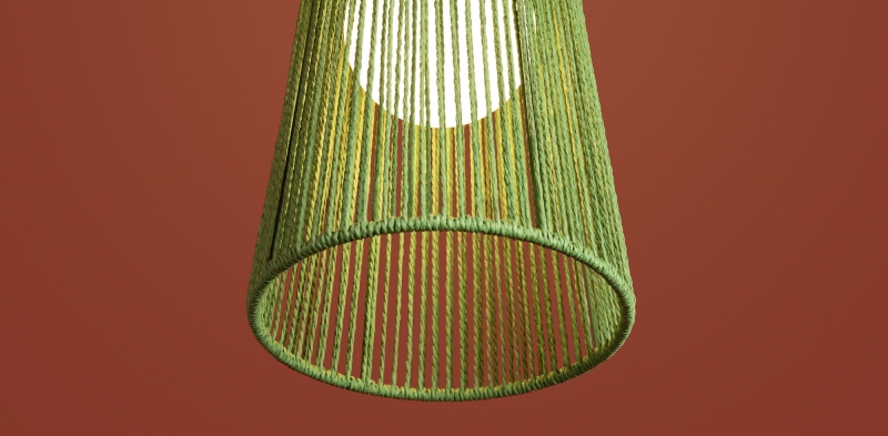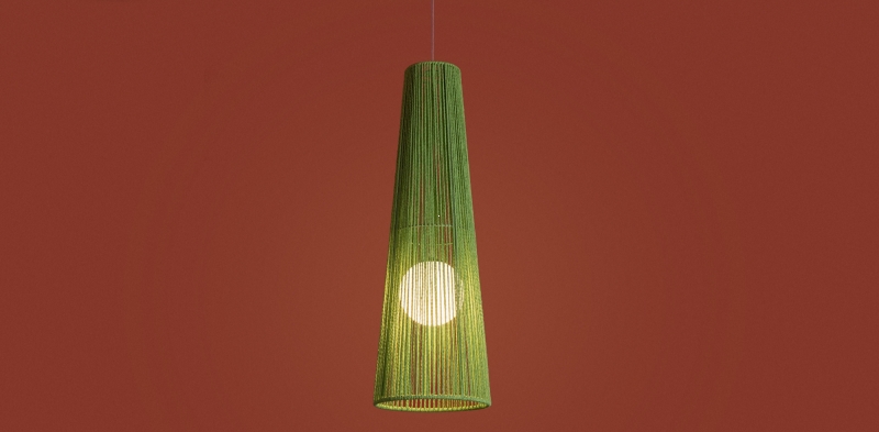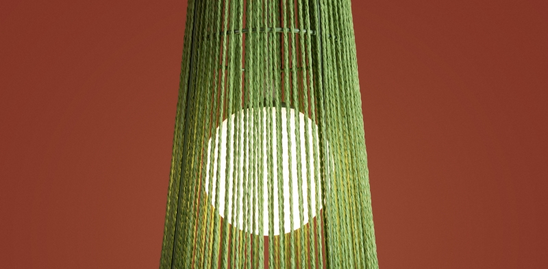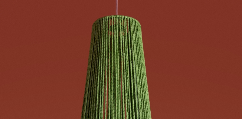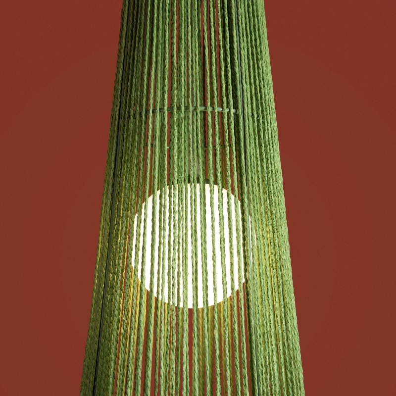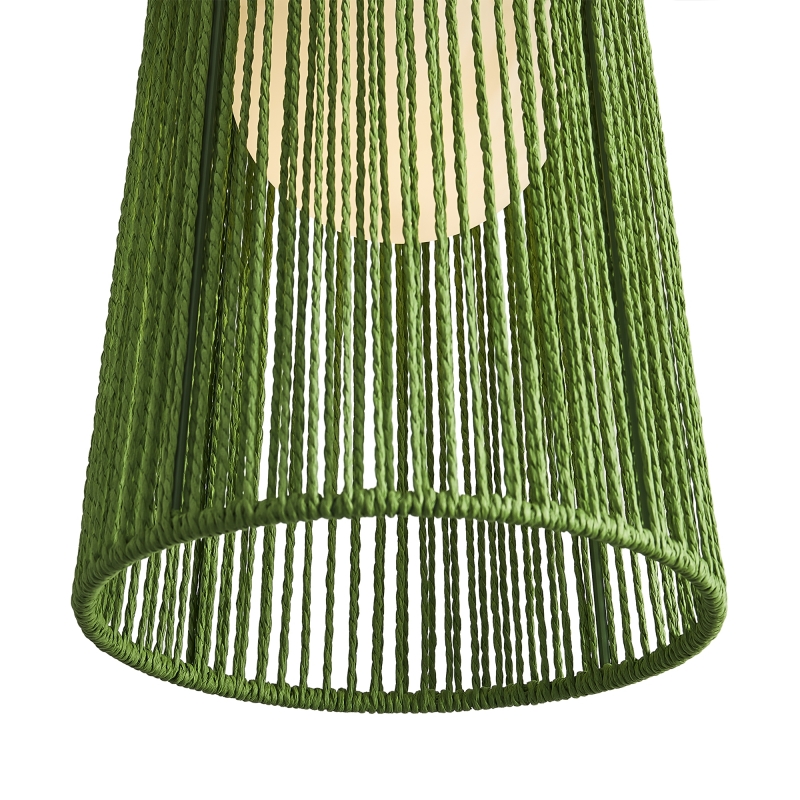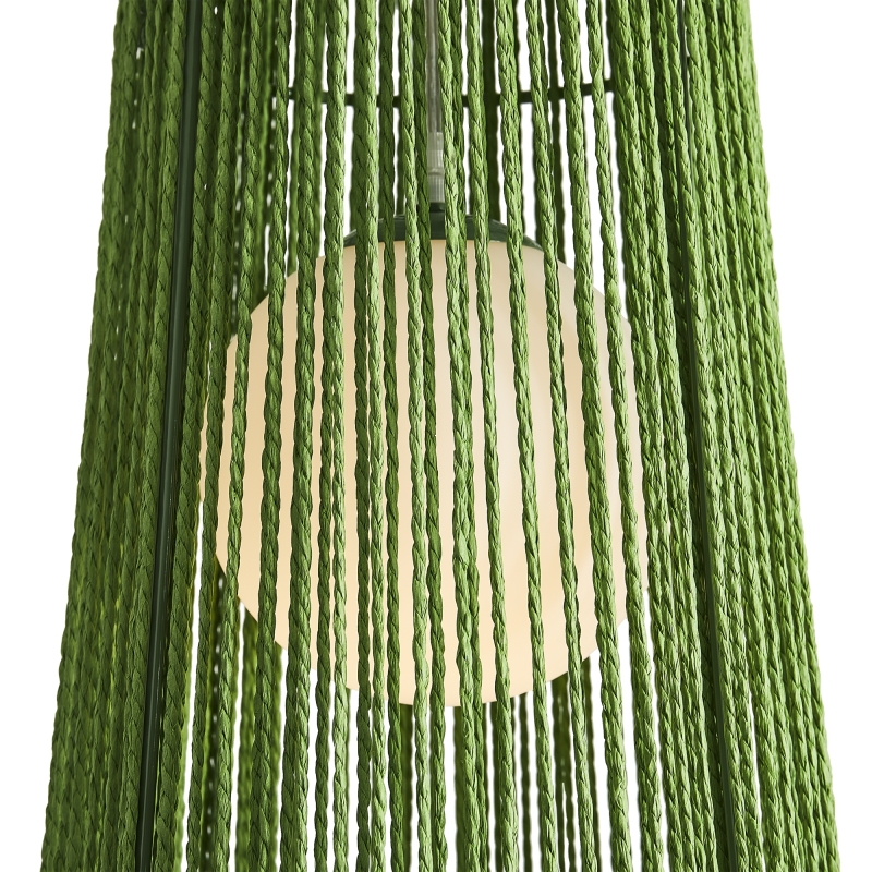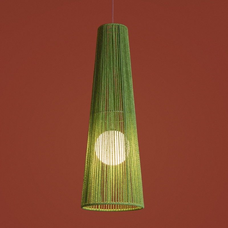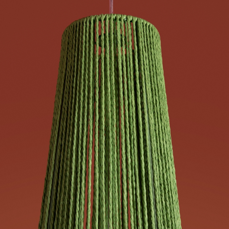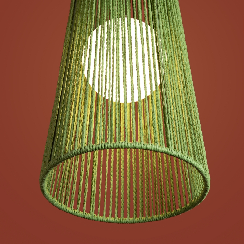 Этот светильник представлен в уникальной форме конуса, что придает ему современный вид. Яркий зеленый цвет абажура из бумажной веревки создает интересный акцент в интерьере. Материал и фактура обеспечивают мягкое рассеивание света, создавая уютное освещение.