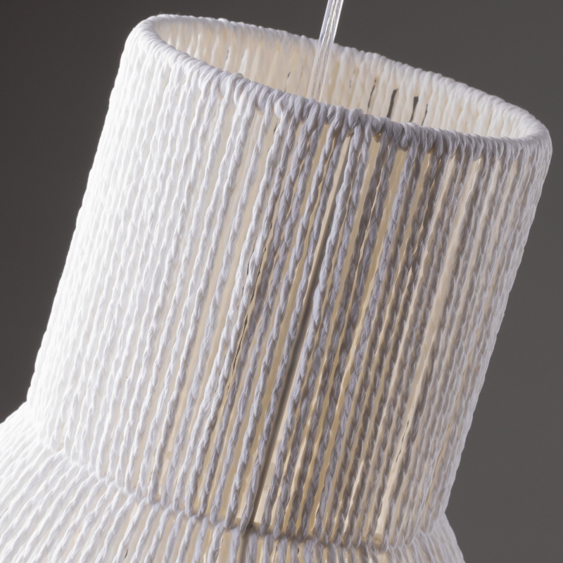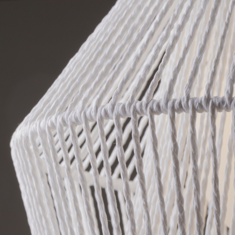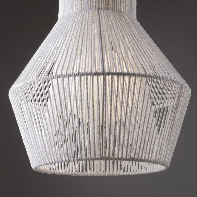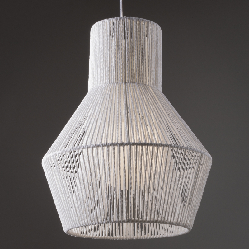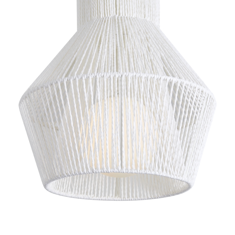 Этот подвесной светильник представляет собой стильный и современный предмет интерьера. Его конструкция выполнена из металла и бумаги, что придает ему легкость и воздушность. Молочный цвет абажура гармонично сочетается с текстурой бумажной веревки, создавая мягкий и уютный свет. Форма светильника напоминает природные элементы, что добавляет ему шарма и эко-дизайна.