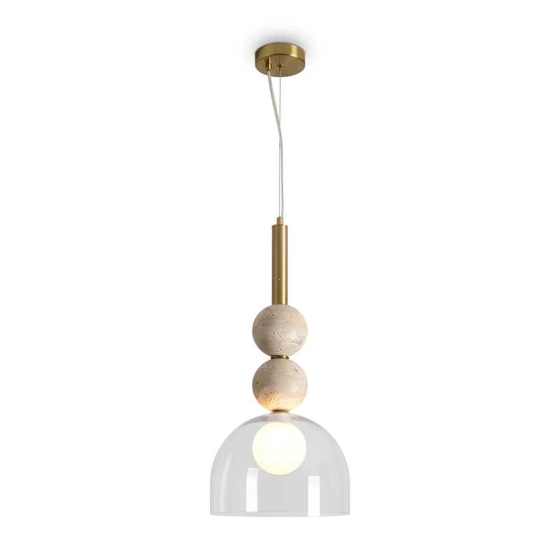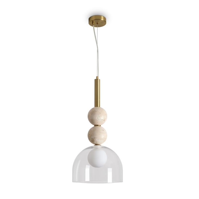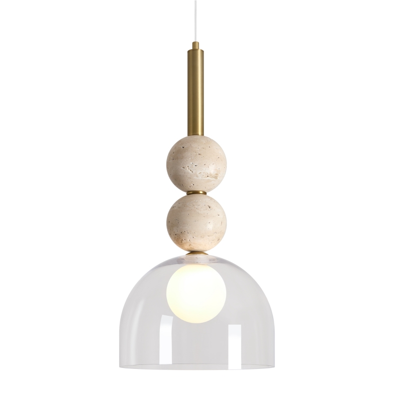 Светильник обладает уникальной конструкцией с полусферическим абажуром, выполненным из прозрачного стекла, который гармонично сочетается с латунным основанием. Декоративные шарики из камня травертин придают изделию особый шарм и элегантность. Стильный и современный, он станет ярким акцентом в вашем интерьере, создавая эффектное освещение и подчеркивая детали дизайна.