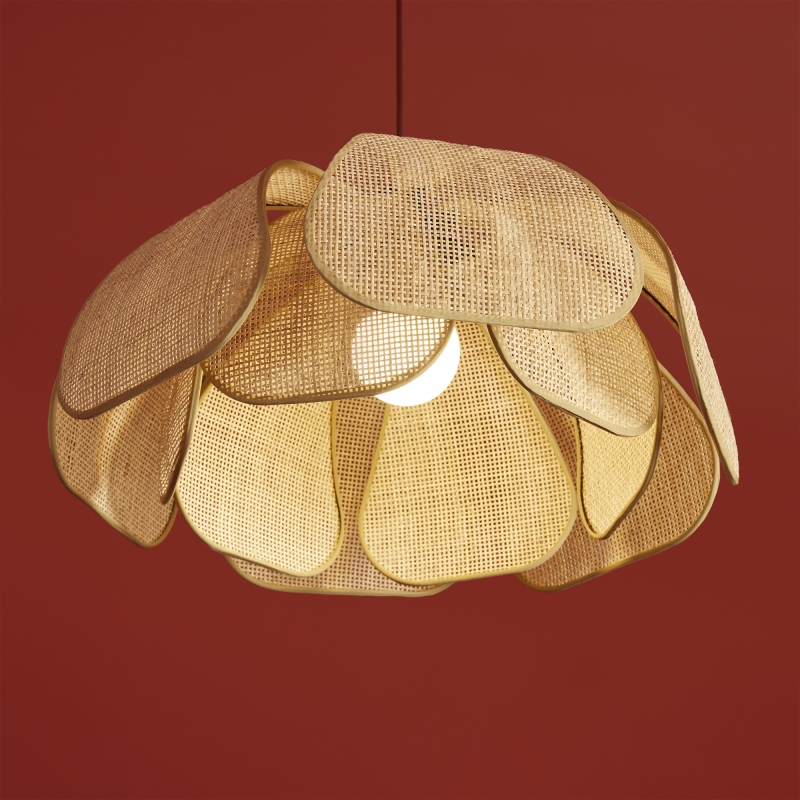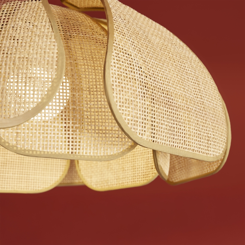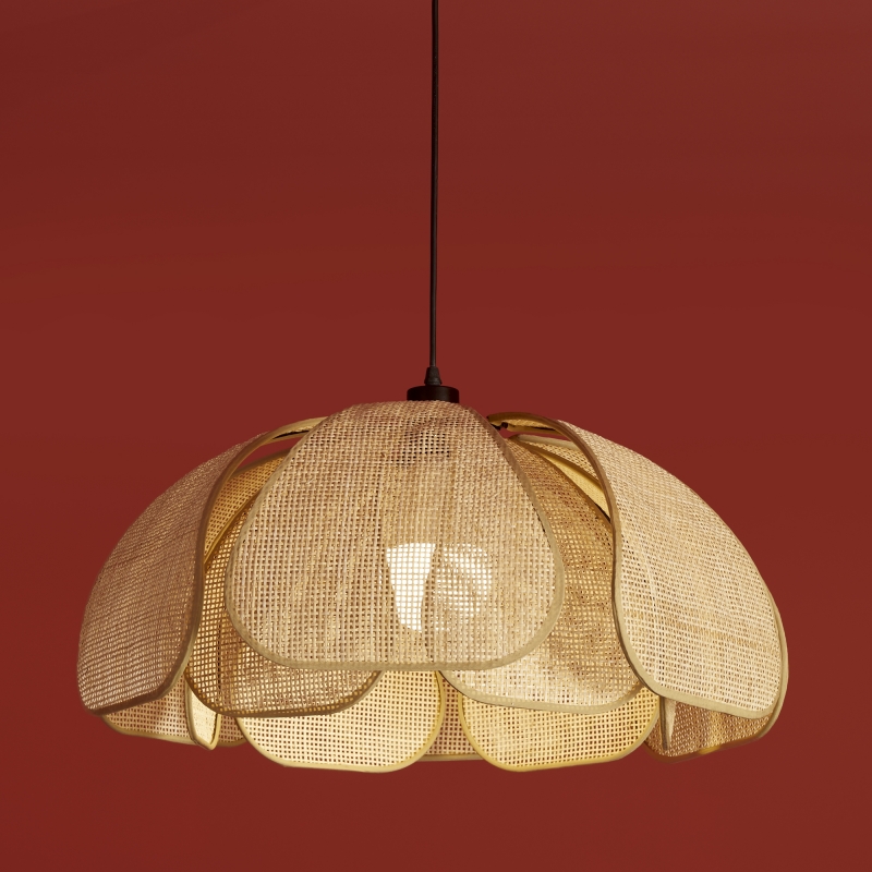 Подвесной светильник Cocoon обладает оригинальной конструкцией в форме цветка, выполненной из натурального ротанга, что придаёт ему легкость и изящество. Черный металлический каркас контрастирует с бежевым абажуром, создавая стильный акцент в любом интерьере. Фактура ротанга добавляет теплоты и природности, а аккуратные линии и форма делают его универсальным элементом декора.