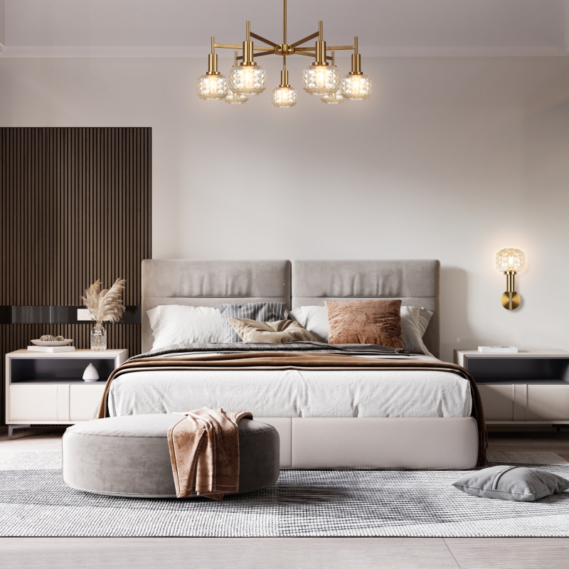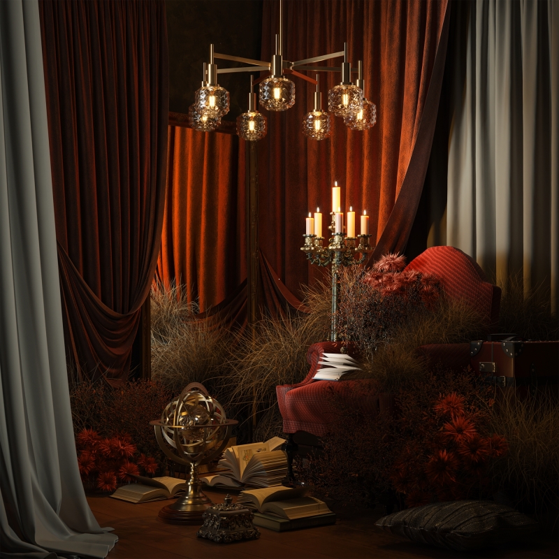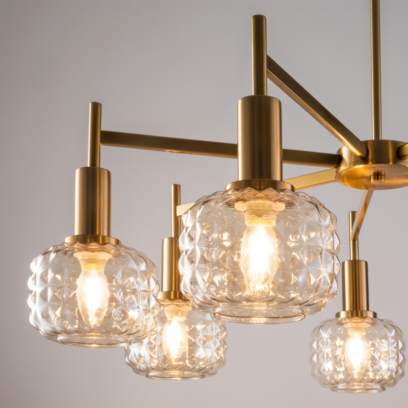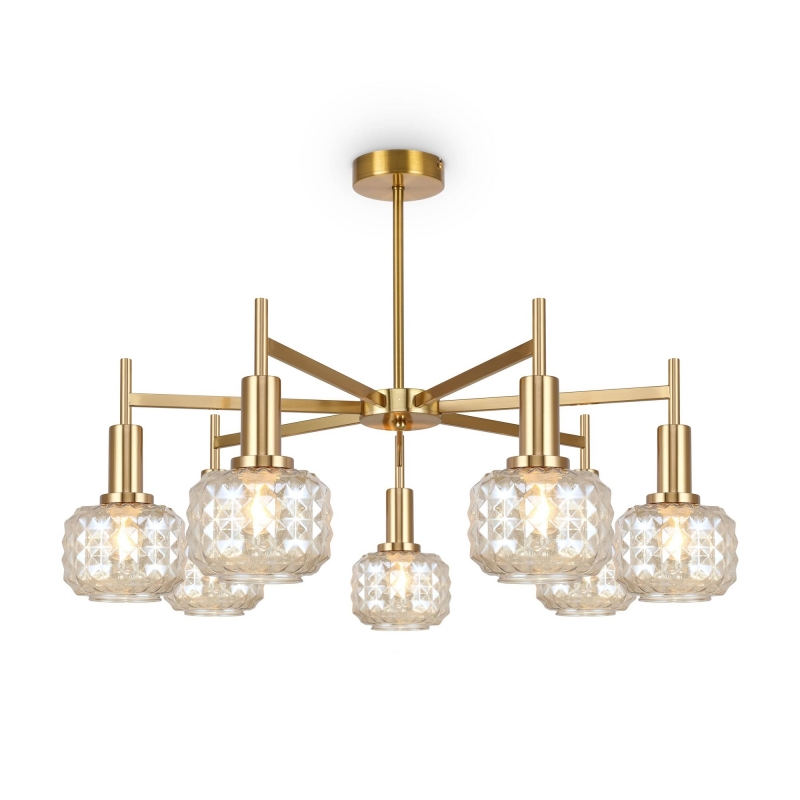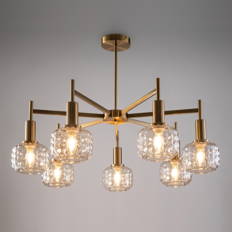 Эта модель представляет собой светильник с 7 плафонами, выполненный в сочетании латунного металла и рельефного стекла. Нестандартная форма абажуров обрамляет свет, создавая волшебные узоры на стенах и потолке. Латунь придаёт изделию роскошный вид, а янтарные плафоны добавляют тепла и уюта.