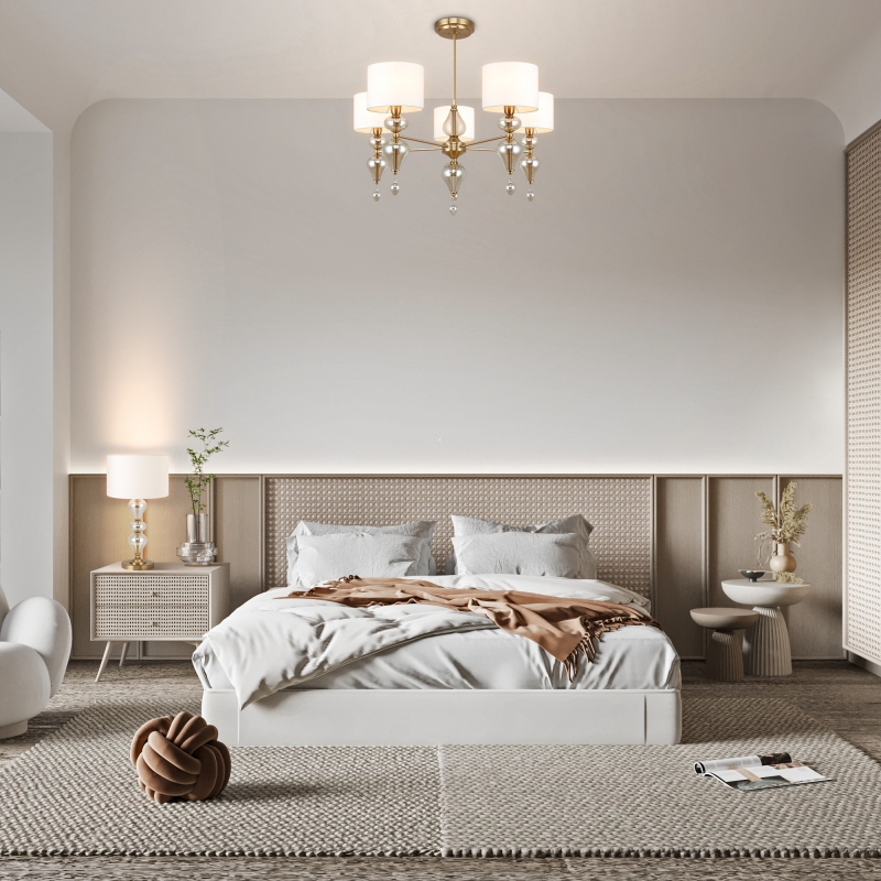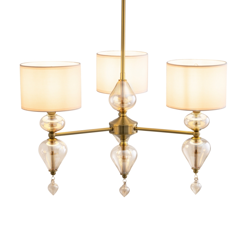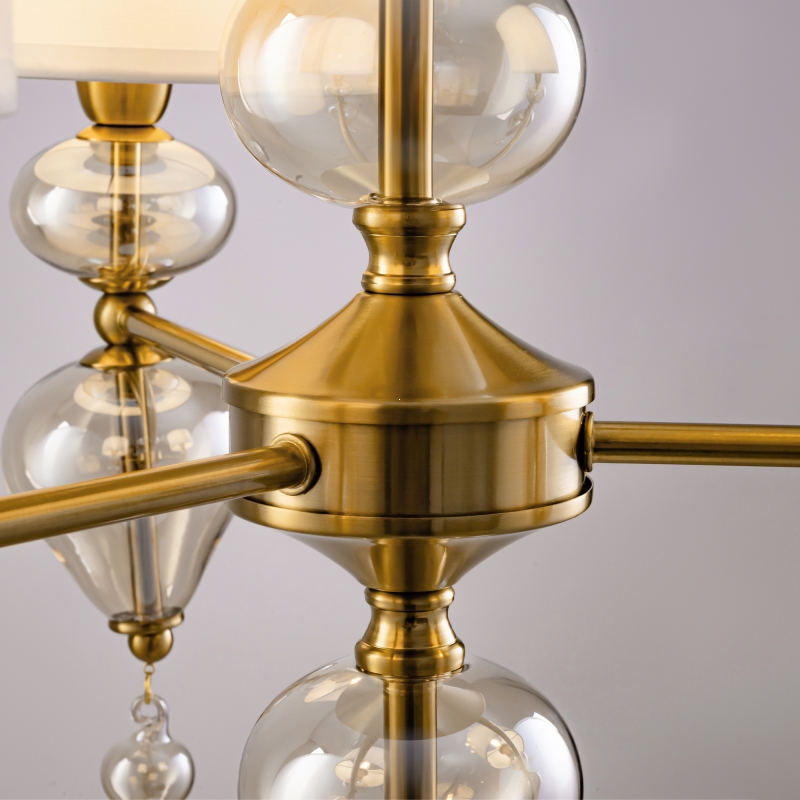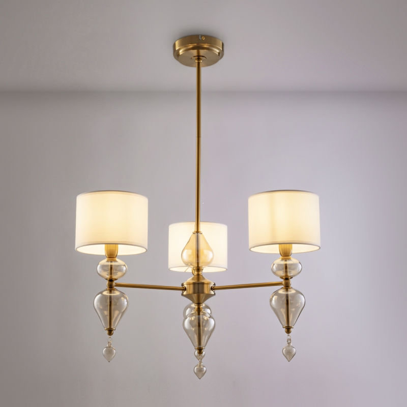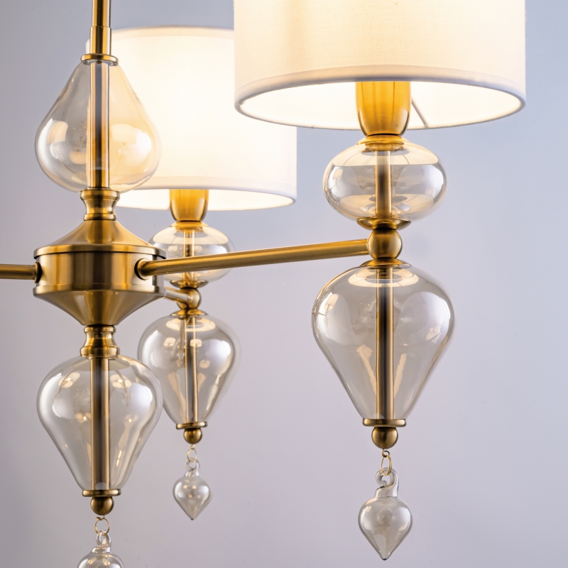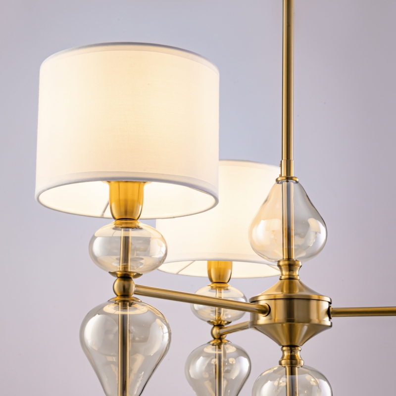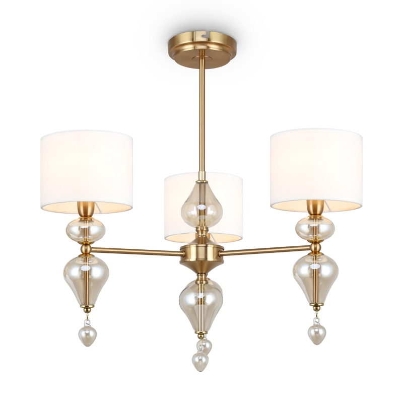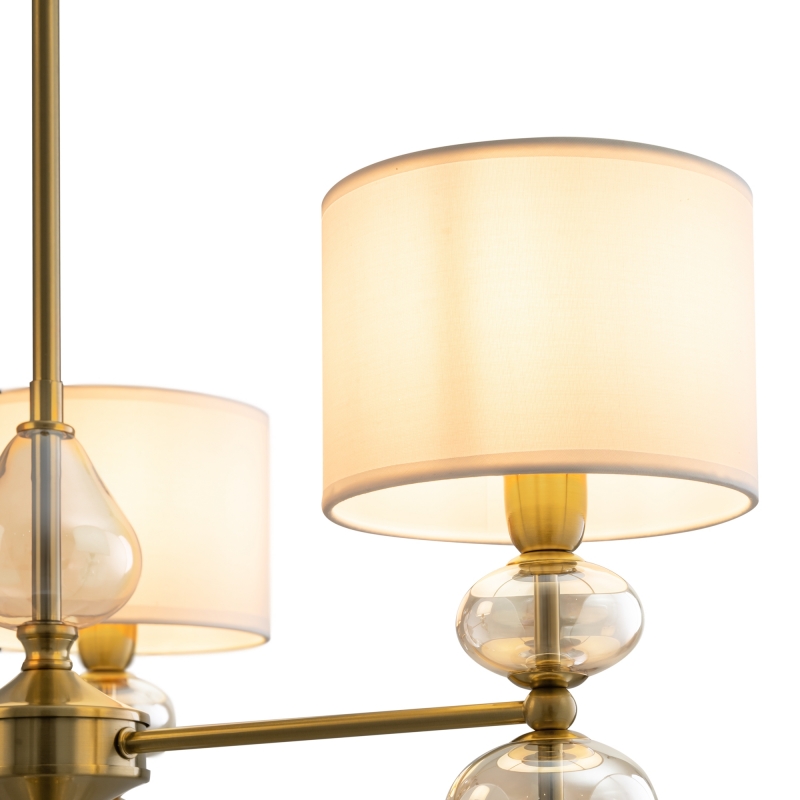 Потолочный светильник Raise выполнен в современном стиле с использованием высококачественных материалов. Конструкция из металла в латунном цвете гармонично сочетается с белыми текстильными абажурами, создавая эффект легкости и воздушности. Уникальные стеклянные элементы с перламутровым напылением добавляют изюминку, подчеркивая утонченный дизайн. Форма светильника напоминает изящный цветок, что делает его идеальным для создания уютной атмосферы.