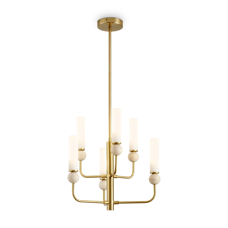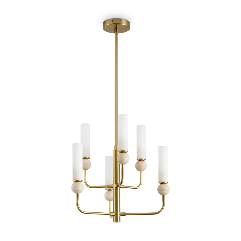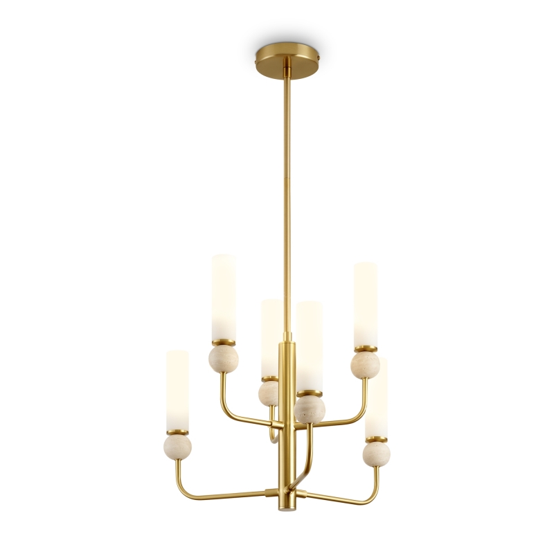Светильник имеет современный и утонченный дизайн, который сочетает в себе латунные элементы и белые стеклянные плафоны. Конструкция состоит из шести плафонов, расположенных на изящных изгибах, что создает эффект легкости и воздушности. Латунный цвет придает изделию роскошный вид, а белое стекло смягчает свет и создает приятную атмосферу.