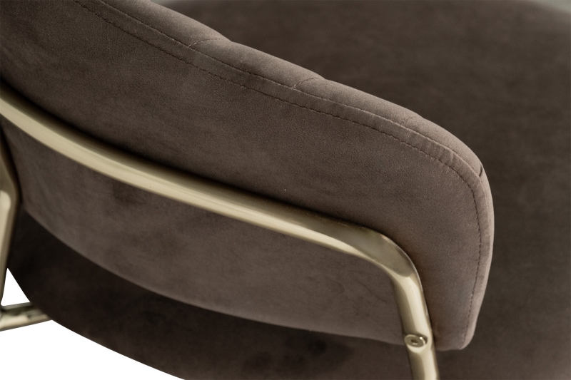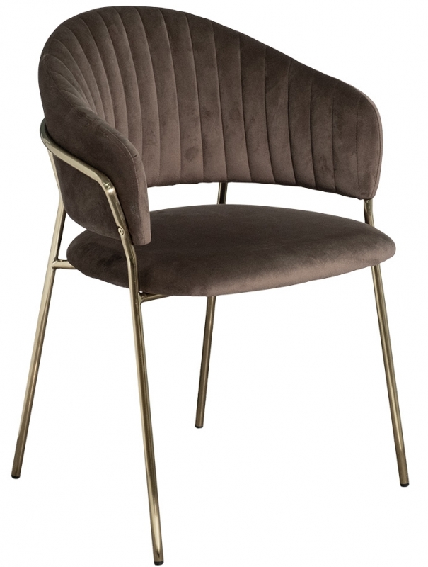 Стул обеденный Sequoy привлекает внимание своей изысканной формой. Выполненный из мягкого темно-коричневого велюра, он создает ощущение уюта и тепла. Спинка с вертикальными складками напоминает театральный занавес, что добавляет драматичности. Тонкий каркас из нержавеющей стали цвета брашированного золота гармонично контрастирует с глубиной обивки, придавая стулу легкость и благородство. Это не просто предмет обстановки, а акцент, который делает каждый обед моментом ритуала.