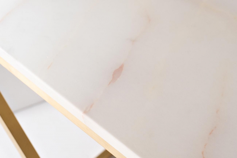 Консоль Bianco Namibia имеет изысканный и современный дизайн, который прекрасно впишется в любой интерьер. Столешница выполнена из качественного мрамора, который придает изделию роскошный вид, а золотая металлическая основа с геометрическим узором добавляет динамики и легкости. Уникальная фактура мрамора и блеск золота создают впечатление безупречного стиля, подчеркивая ваш утонченный вкус.