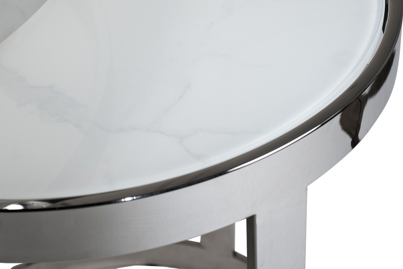 Комплект состоит из двух столиков, которые отличаются по размеру, что добавляет динамики в оформление пространства. Столешницы столиков выполнены из прочного стекла с элегантным мраморным узором, а металлические рамки из нержавеющей стали придают им современный вид. Сочетание белого и серебристого цветов создает легкость и воздушность, а также позволяет легко вписать столики в любой интерьер.