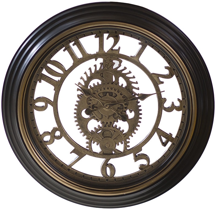 Часы представлены в стандартной круглой форме, выполнены в классическом стиле. Их цветовая гамма включает глубокие черные и золотистые оттенки, что добавляет им элегантности. Открытый часовой механизм с крупными римскими цифрами и стильными стрелками привлекает внимание и становится центральным элементом декора. Эти часы излучают тепло и уют, идеально подходя для любого классического интерьера.