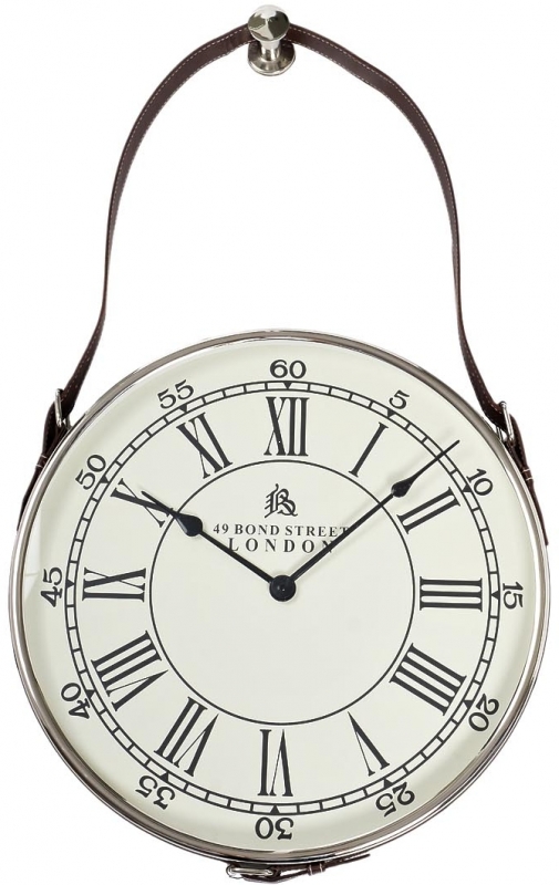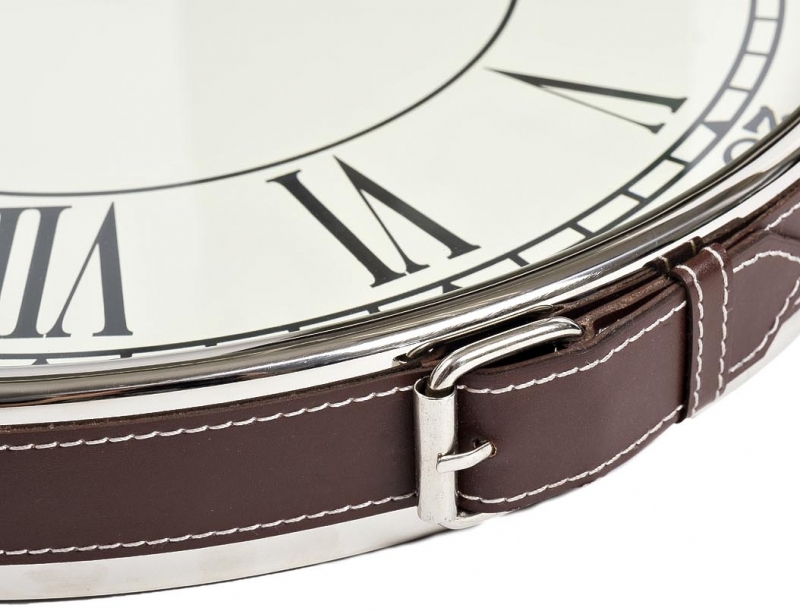 Часы имеют круглый циферблат, обрамленный металлом с легким блеском. Их уникальная особенность – кожаный ремень, который служит подвесом, придавая изделию эксклюзивный вид. Цветовая гамма включает в себя мягкие нейтральные тона, что позволяет легко интегрировать их в различные интерьеры. Римские цифры и минутные деления на циферблате делают модель не только стильной, но и функциональной.