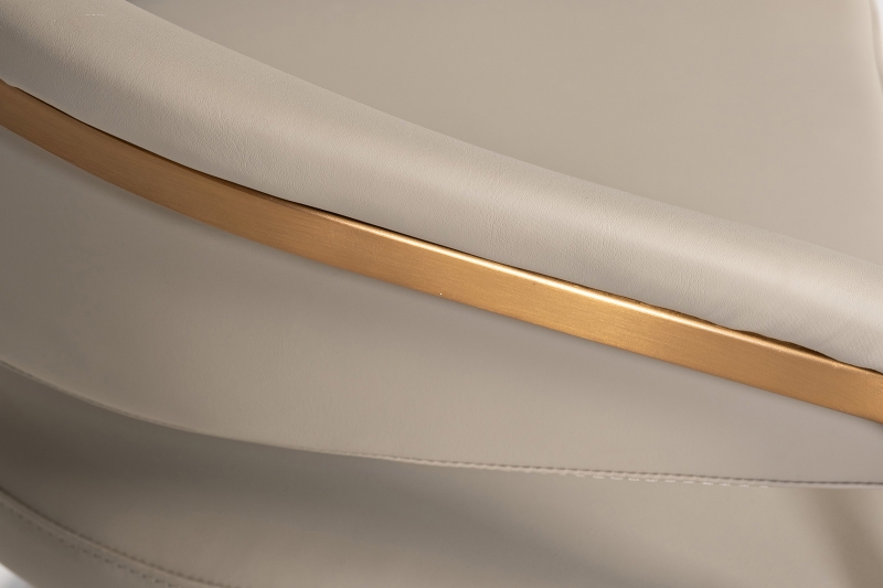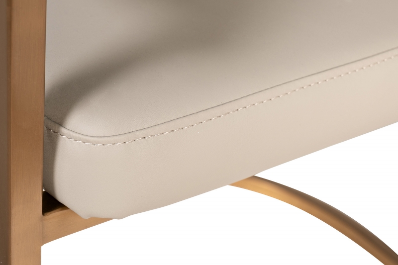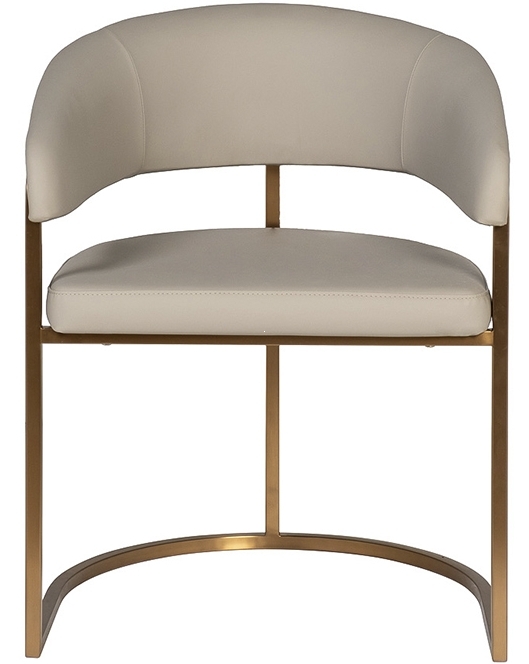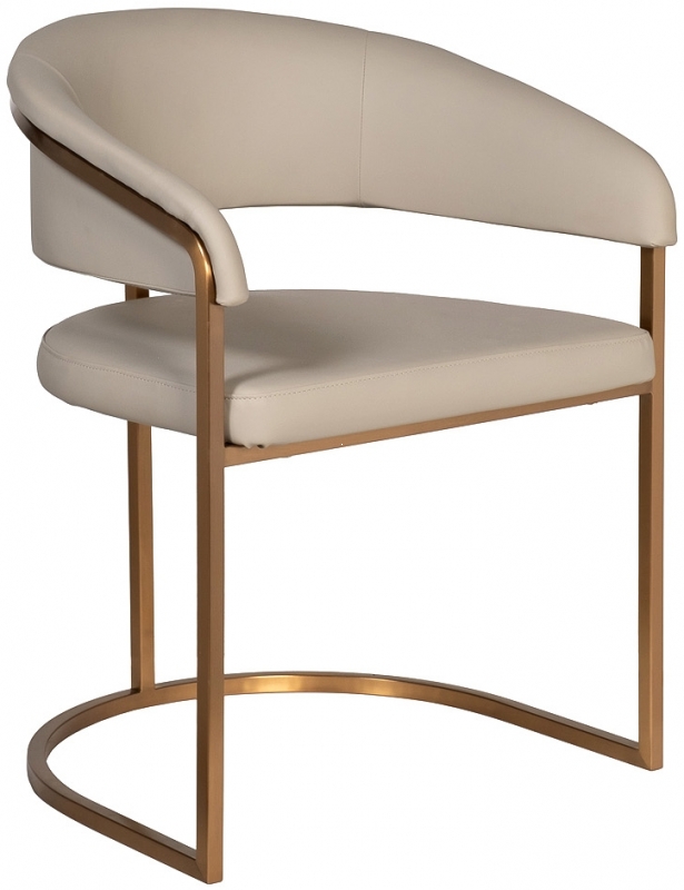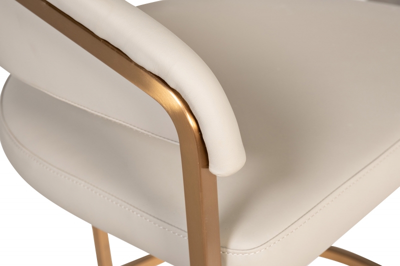 Стул Surge выделяется своей современной эстетикой. Конструкция из прочного металлического каркаса с матовым золотым оттенком гармонично сочетается с мягким сиденьем и округлой спинкой, обитыми искусственной кожей. Цветовая гамма — светлые, нейтральные оттенки, что делает его универсальным элементом для любого интерьера. Дополнительная деталь — мягкие подлокотники, создающие ощущение защиты и комфорта. Стул становится настоящим акцентом вашей обеденной зоны.