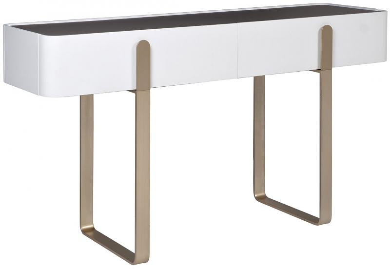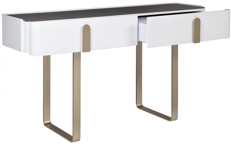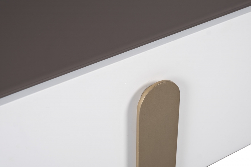 Элегантная и стильная консоль в белом цвете – отличное решение для помещений в современном дизайне. Модель имеет продолговатую форму со скругленными краями и плоскими ножками. Столешница выполнена из прочного стекла в темном цветовом решении, которое гармонично дополняет МДФ белого цвета. Мебель оснащена двумя скрытыми нишами с плоскими ручками, которые декоративно обыграны с формой ножек матового золотистого оттенка. Консоль от Garda Decor эффектно впишется в интерьер гостиной или спальни, занимая минимум места и предлагая дополнительное пространство для хранения личных вещей.