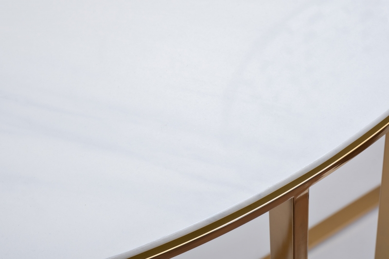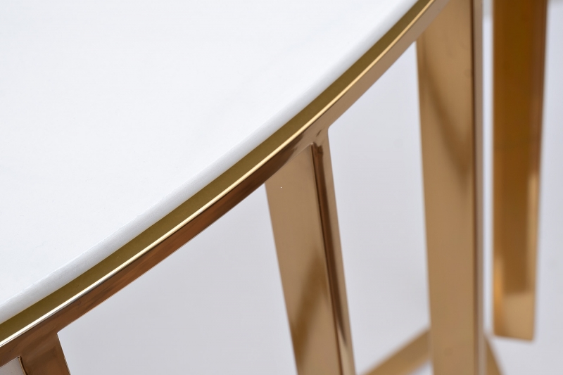 Консоль Alise представляет собой изящный предмет мебели с уникальной формой, выполненной из прочной нержавеющей стали и стеклянной столешницы с эффектом мрамора. Золотистый каркас, в сочетании с белоснежной столешницей, создает гармоничное и современное впечатление. Легкие линии и лаконичность оформления подчеркивают стиль ар-деко, добавляя нотку роскоши. Столешница с имитацией мрамора не только красиво выглядит, но и легко чистится, что делает её практичным выбором для любого дома.