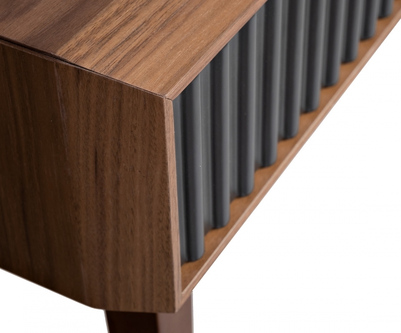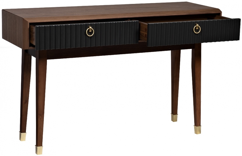 Консоль Trafford — это гармоничное сочетание простоты и элегантности. Верхняя поверхность выполнена из качественного МДФ с отделкой шпоном, что придает ей стильный вид. Цветовая гамма — благородный коричневый с черными акцентами, что делает консоль универсальной для любого интерьера. Легкие металлические ножки с золотистыми элементами добавляют нотку современности, а рифленые ящики придают мебели характер и оригинальность. Ощущение, создаваемое этой консолью, — это теплая и уютная атмосфера, способствующая расслаблению.
