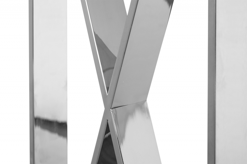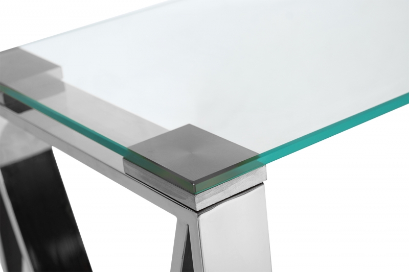 Консоль Tricia обладает изысканным дизайном, который сразу привлекает внимание. Ее прозрачная стеклянная столешница толщиной 8 мм создает эффект невесомости, а тонкие грани хромированного основания добавляют современный шик. Стиль модерн и нео-классика гармонично сочетаются в этой модели, которая выглядит элегантно и стильно, независимо от освещения.