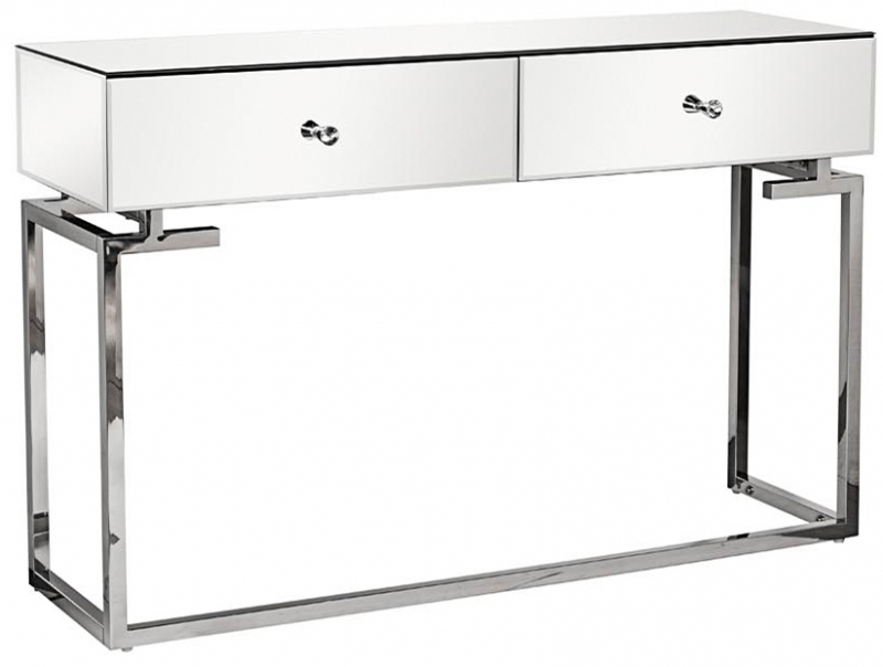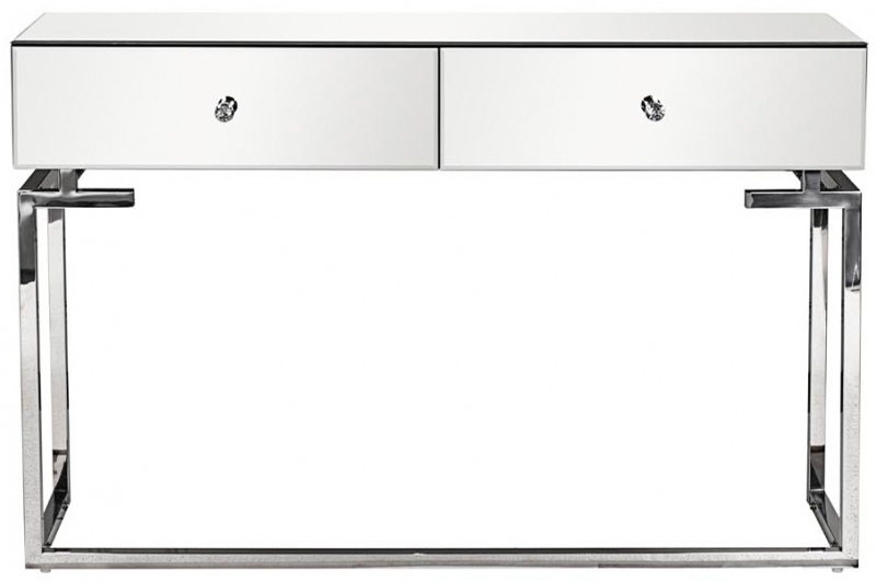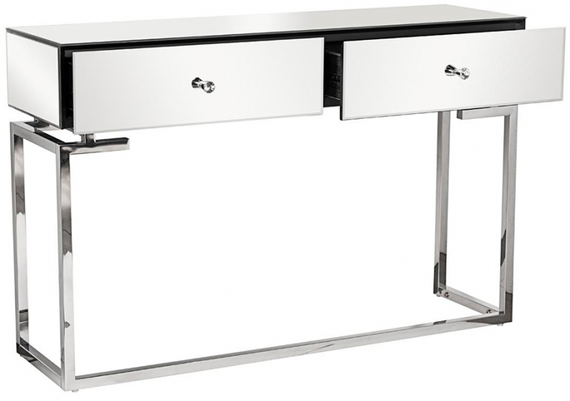 Эффектная зеркальная консоль украсит вашу спальную комнату, гостиную или гардероб. Два удобных выдвижных ящика подходят для хранения косметики, украшений, щеток и других мелочей. Опора из полированной стали заменяет традиционные ножки и прекрасно сочетается с серебристым зеркалом столешницы и фасада. Прямые линии и зеркальная облицовка позволяют вписать консоль в интерьер в любом цветовом решении, добавляя в обстановку элементы игры и артистизма.