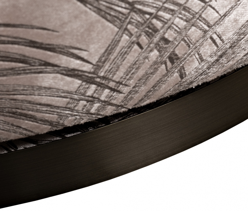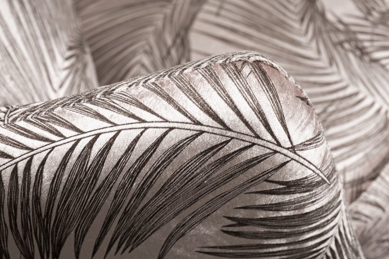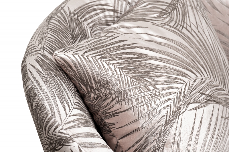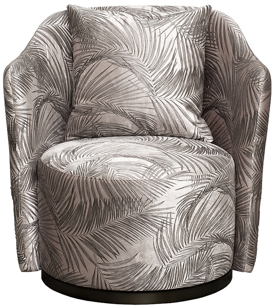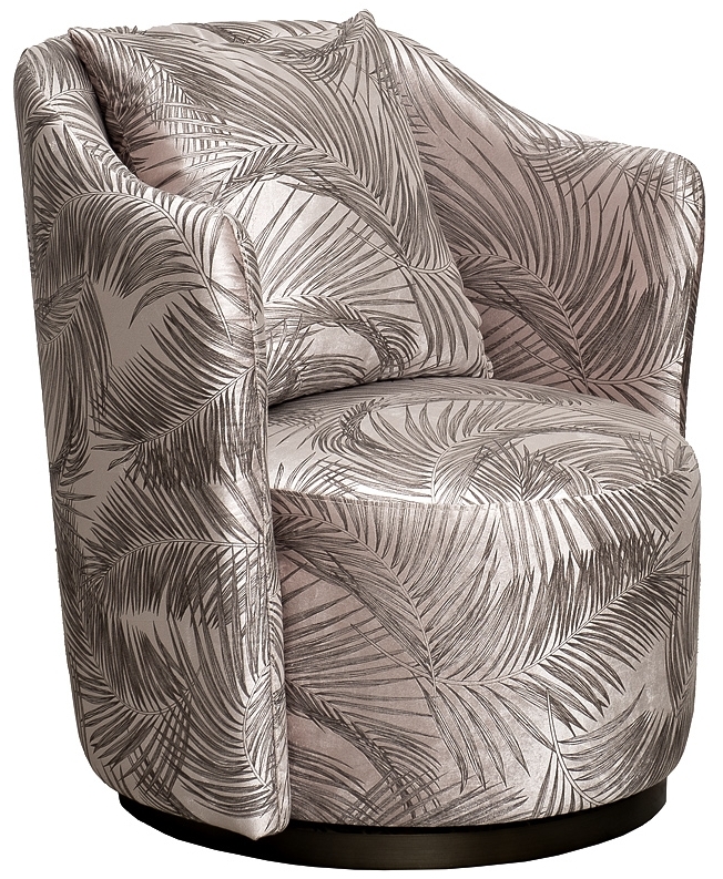 Кресло Verona — это вращающееся кресло с обивкой из вельвета с оригинальным принтом «пальмовые листья». Его обтекаемая форма и мягкие линии привлекают взгляд, а цветовая гамма, сочетание бронзового металлического основания и пастельных тонов ткани, создают гармоничный ансамбль. Отдельно стоит отметить комфортную спинку с подлокотниками и мягкую подушку, которая обеспечивает невероятное ощущение уюта.