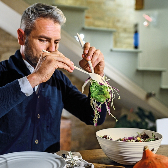 Приборы для салата Tierra отлично гармонируют с другими предметами коллекции. В сочетании с миской или блюдом они образуют идеальную композицию для сервировки, которая будет одинаково хорошо смотреться как в повседневной, так торжественной обстановке. Можно мыть в посудомоечной машине. Приборы не подходят для микроволновой печи. Коллекция посуды Tierra поможет создать красоту при сервировке стола и сохранить окружающую среду. Изделия разработаны Pio&Tito Toso по запатентованной технологии из перерабатываемого продукта. В качестве исходного сырья выступают пластиковые бутылки объемом 1,5 л. Дизайн изделий напоминает керамику, а реалистичности внешнему виду придает тщательно подобранные пастельные цвета.