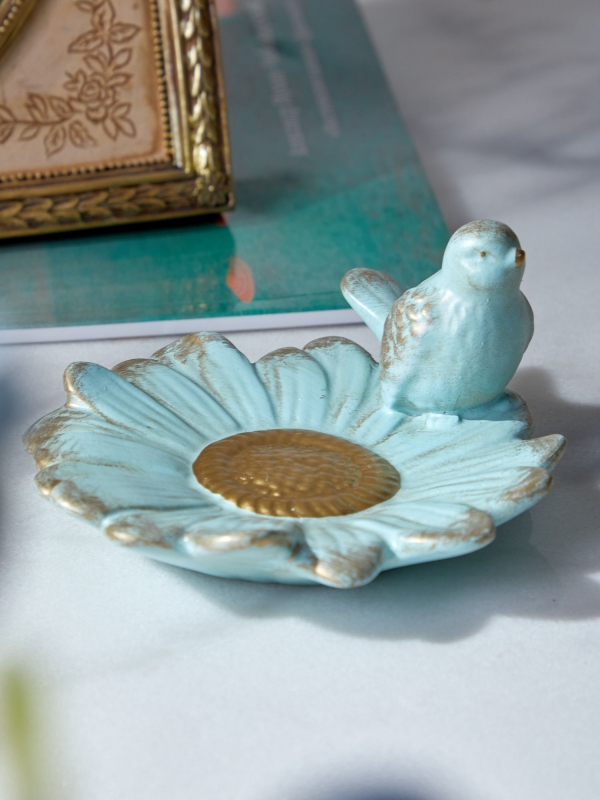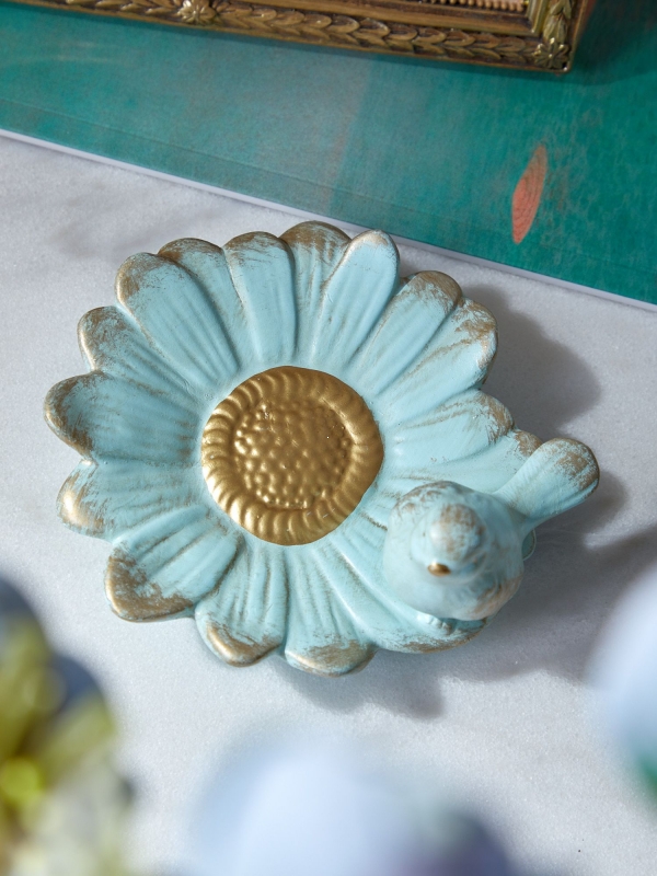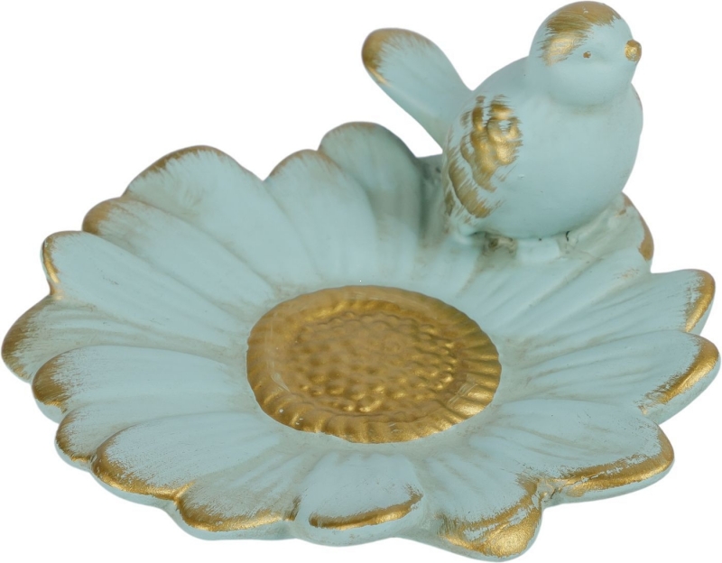 Декоративное блюдо Tapio в нежно-бирюзовом цвете с золотистой патиной выполнено в виде распустившегося цветка, край которого украшает миниатюрная птичка. Плавные лепестки формируют выразительную чашу, а рельефная сердцевина с золотым акцентом делает композицию особенно живой и объемной. Состаренная отделка подчеркивает винтажный характер изделия и придает ему ощущение вещи с историей. Мягкая пастельная гамма смотрится свежо и деликатно, а сочетание бирюзового оттенка с теплым золотом добавляет интерьеру света, тепла и декоративной глубины. Блюдо воспринимается не только как функциональный аксессуар для мелочей, но и как маленький арт-объект.