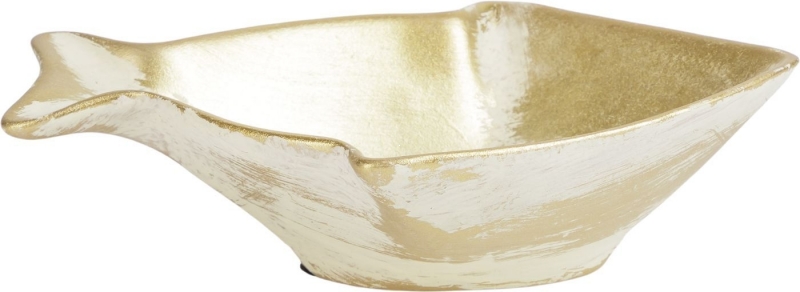Декоративное блюдо Tuulikki в золотистом цвете выполнено в необычной органичной форме, напоминающей стилизованный лист или рыбку, поэтому выглядит не просто как аксессуар, а как маленький арт-объект. Мягкий металлический блеск красиво отражает свет и делает композицию более живой. Фактура поверхности слегка неоднородная, с эффектом ручной отделки, благодаря чему блюдо смотрится теплее и выразительнее, чем гладкий глянец. Приподнятые края добавляют глубину и делают предмет удобным не только для декора, но и для аккуратного хранения украшений, свечи или небольших мелочей. Образ получается элегантным, уютным и немного винтажным.