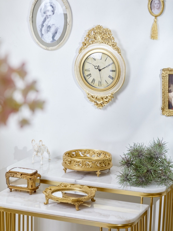 Эта модель особенно уместна в классическом, неоклассическом, барочном и романтическом интерьере. Она хорошо смотрится в пространствах с золотыми акцентами, светлой мебелью, мраморными фактурами, зеркалами и текстилем в мягкой палитре. Поднос Henrieta помогает связать между собой настенные часы, рамы, подсвечники и другие декоративные элементы. В эклектичной обстановке он становится выразительным акцентом, а в женственном будуарном интерьере поддерживает ощущение изящества, уюта и продуманной декоративности.